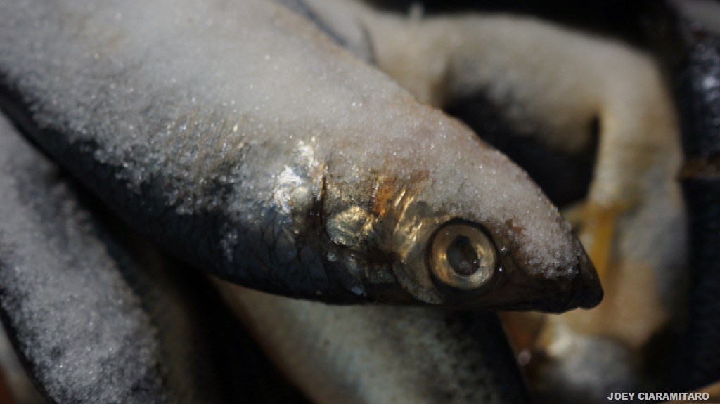 Salted herring and mackerel sit in vats, preserved for use as lobster bait.