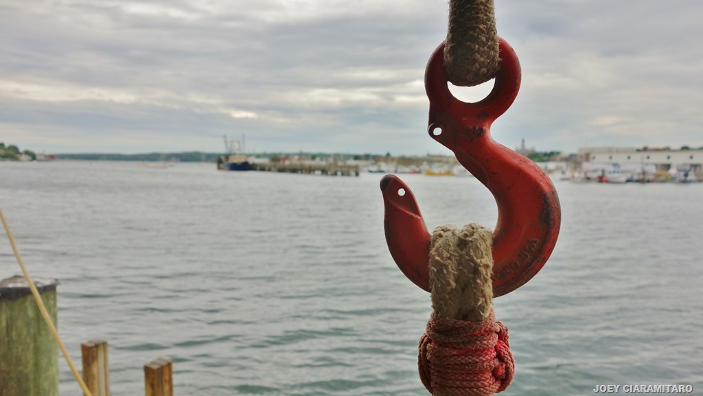 You couldn’t have dreamed up the clouds or the sun breaking through at just the right angle to lead straight down the harbor to our dock. You couldn’t have dreamed up the lobster boats waiting to offload at just the right perpendicular locations to frame the shot on either side of the lobster boat’s mast that was tied up at the dock. Picture perfect.