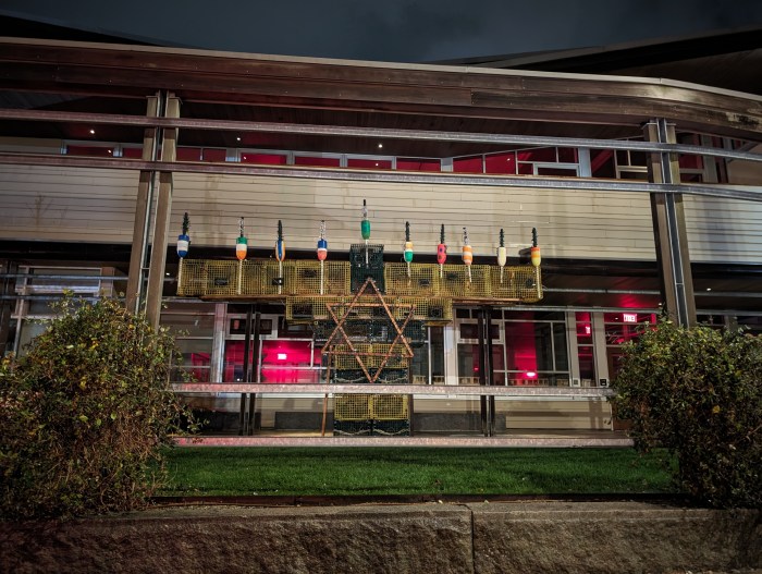 Day | Night photos: Lobster trap menorah is up. The 3rd candle will be lit in sequence tomorrow. The shamash candle raised in the center is lit first, to help light the others.