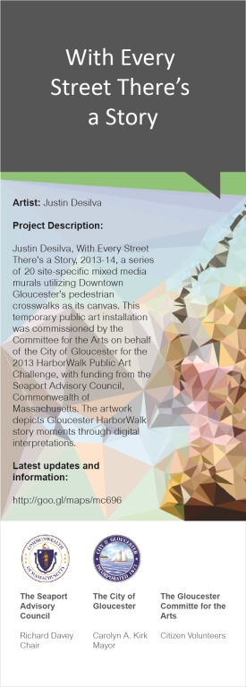 Artist Justin Desilva has completed several more crosswalks: Our Lady of Good Voyage, Lobsters, Howard Blackburn, and St. Peter’s Square. He’s had several requests for a postcard or some take away about his temporary project. If you see him, ask for a bookmark. Some of the murals are at different stages in their installation process; you will see him going back and forth to different sites. As this project is temporary, Justin will remove his work at the conclusion of his exhibit.