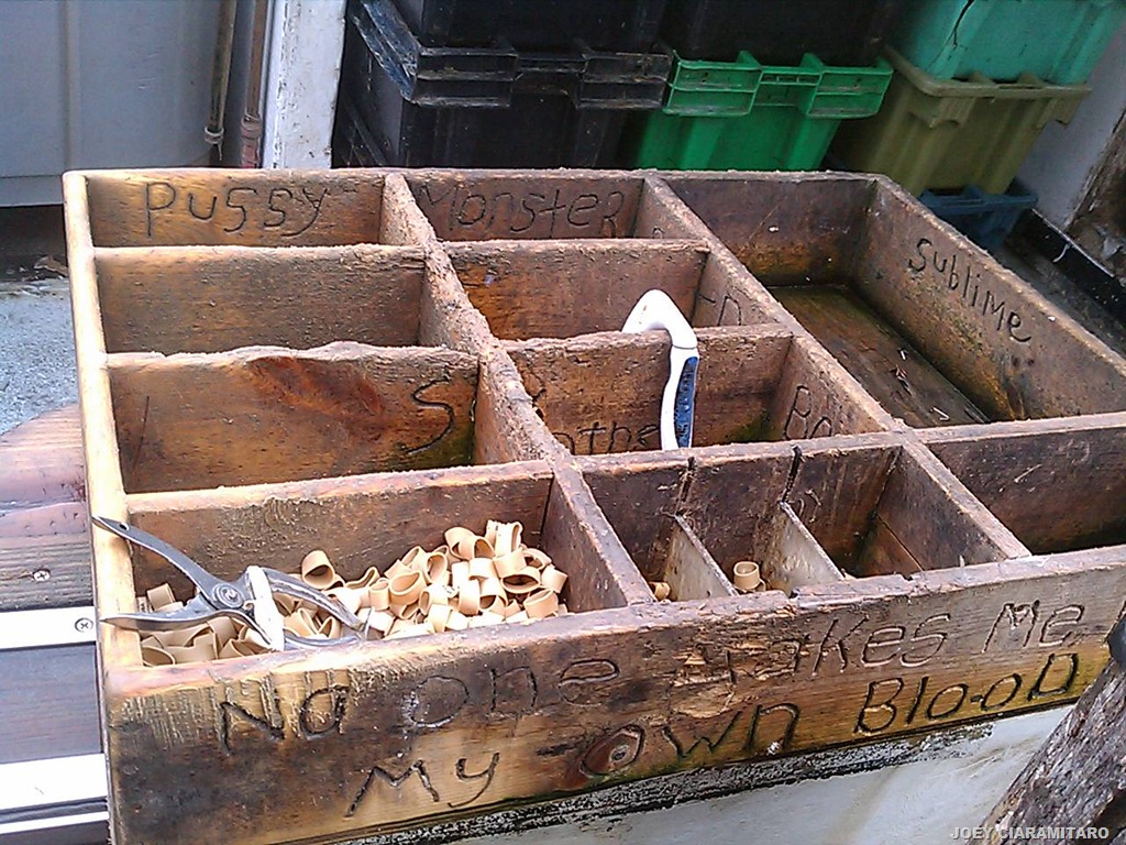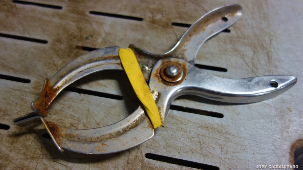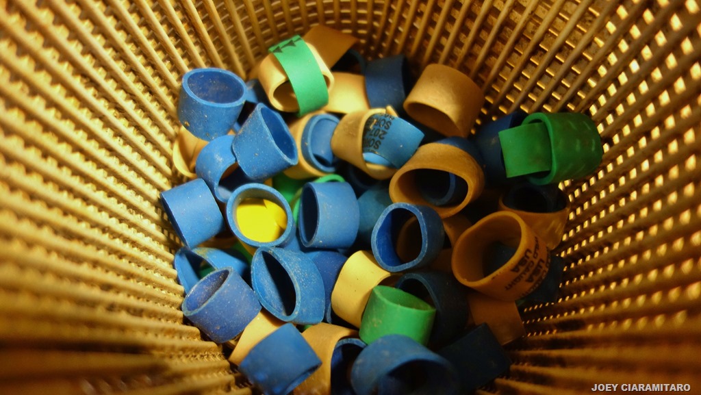 Lobster bands and banding tool.  As the traps come up from the ocean floor, hopefully full of lobsters the lobsters that need to be gauged for size get tossed into the slots and then measured and the ones that are legal sized get banded and thrown into the holding tank til they get in to offload.