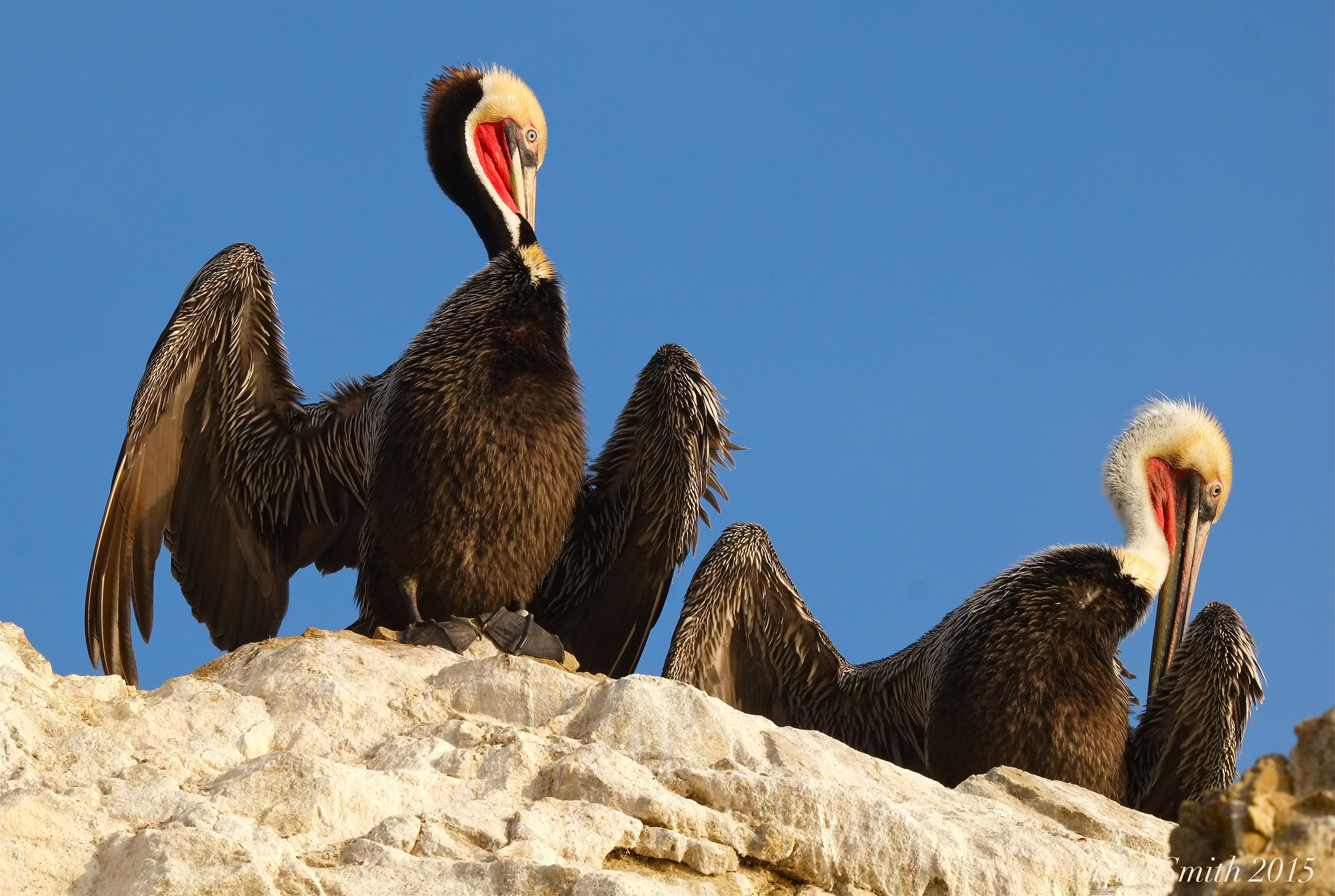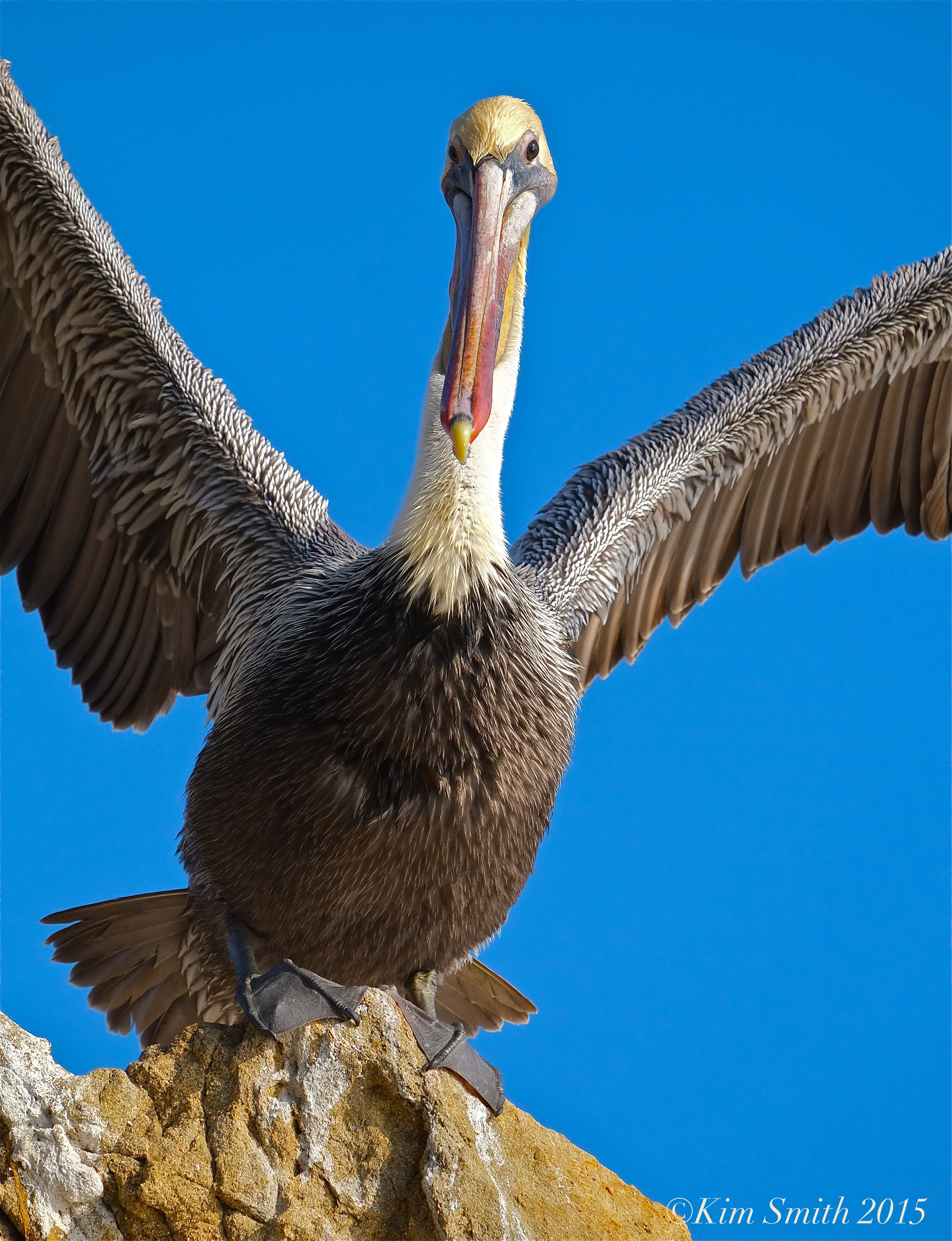 When I was a young girl my family lived in Southern California for several years. I recall seeing few, if any, brown pelicans at our local beaches. Due to the widespread use of DDT in agriculture, brown pelicans on both the east and west coasts, along with other species of birds, were made nearly extinct. Pelicans incubate their eggs with the skin of their feet, essentially standing on the eggs to keep them warm. DDT caused thinning of the eggshells and when the pelican parents stood on the eggshells, the shells fractured and broke.California Brown Pelican preening ©Kim Smith 2015