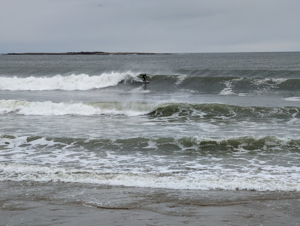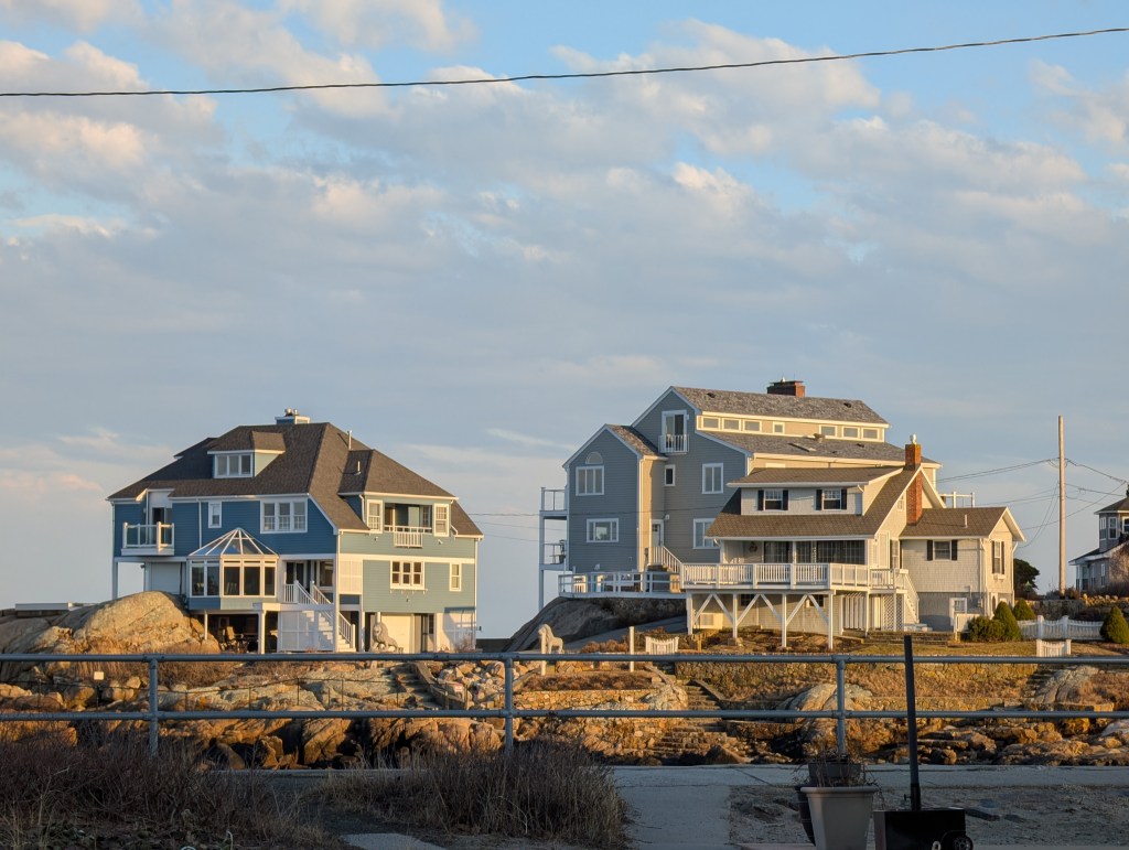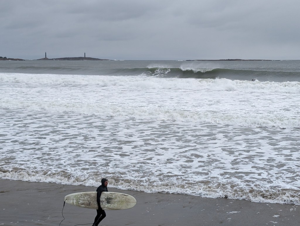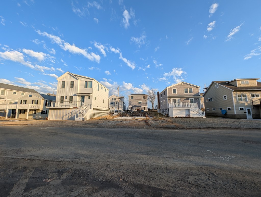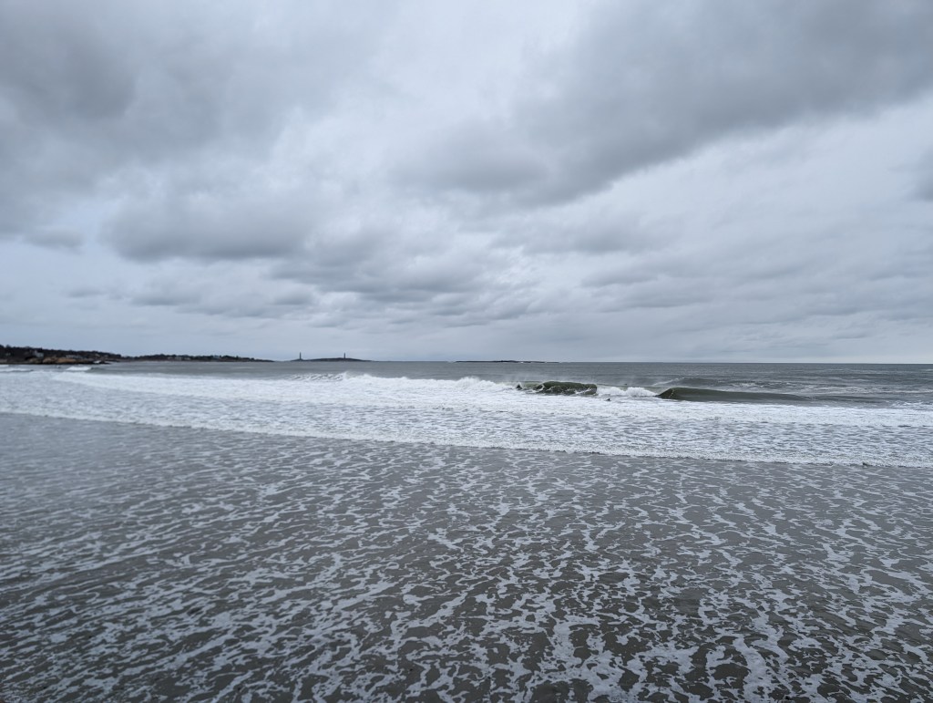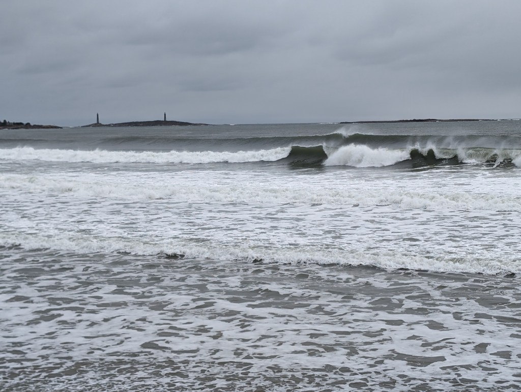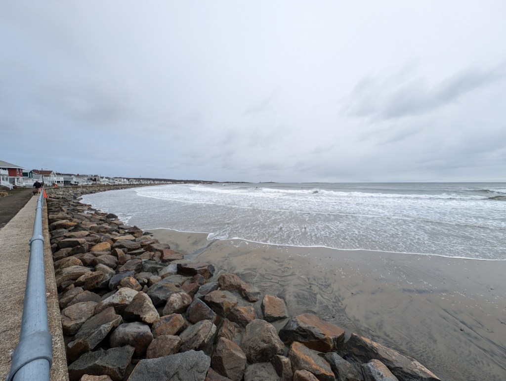 photo caption: 3/10/2024 at about high tide, views from Gloucester and Rockport, Long Beach, Twin Lights. Before the sun came out, the wind was strong enough this morning to move a portapotty off site 100′ down a street. Later, when the sun broke, waves in the surf matched up with a cloud filled blue sky.