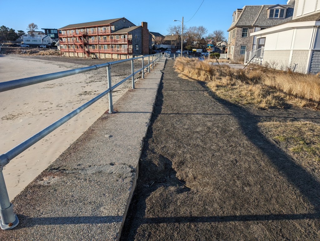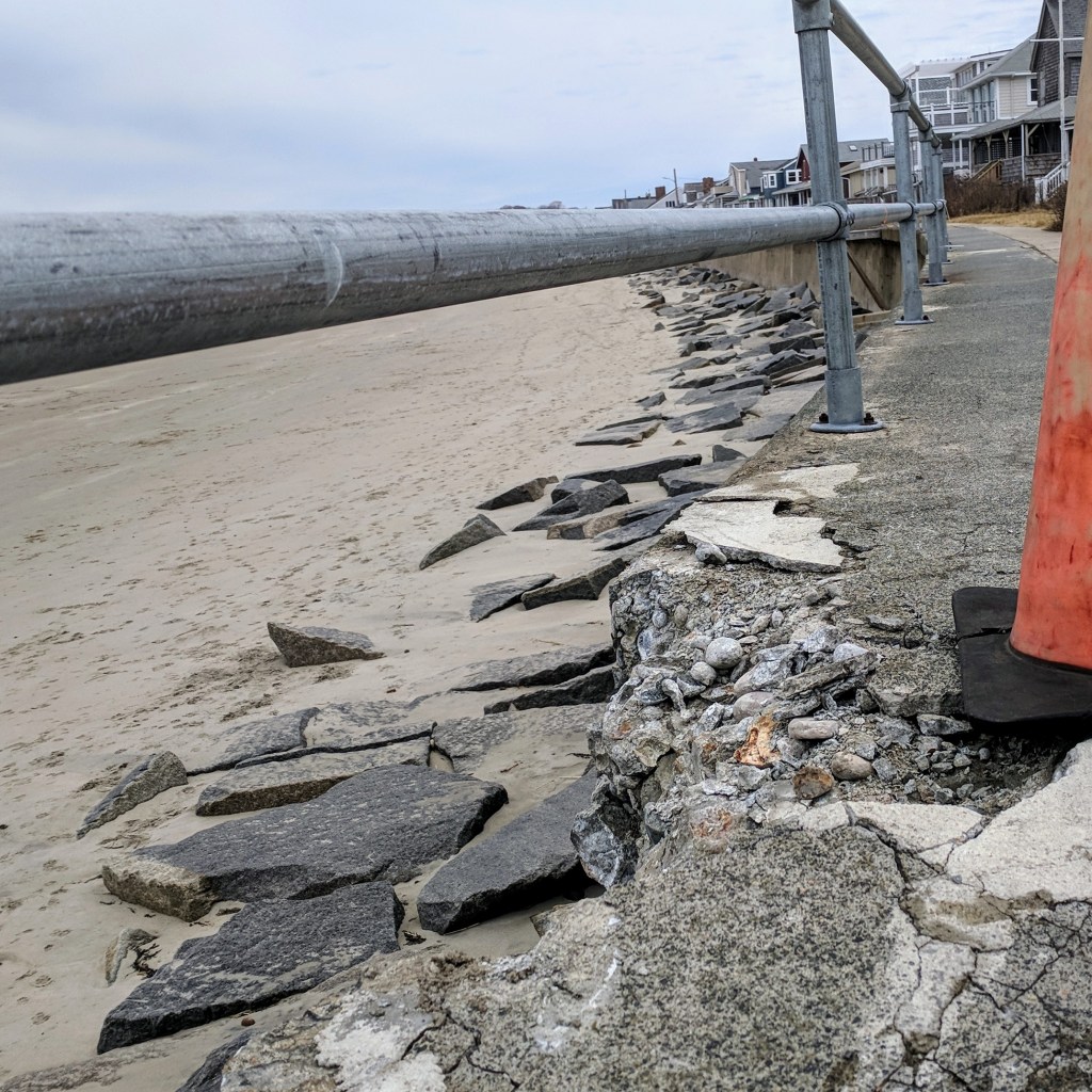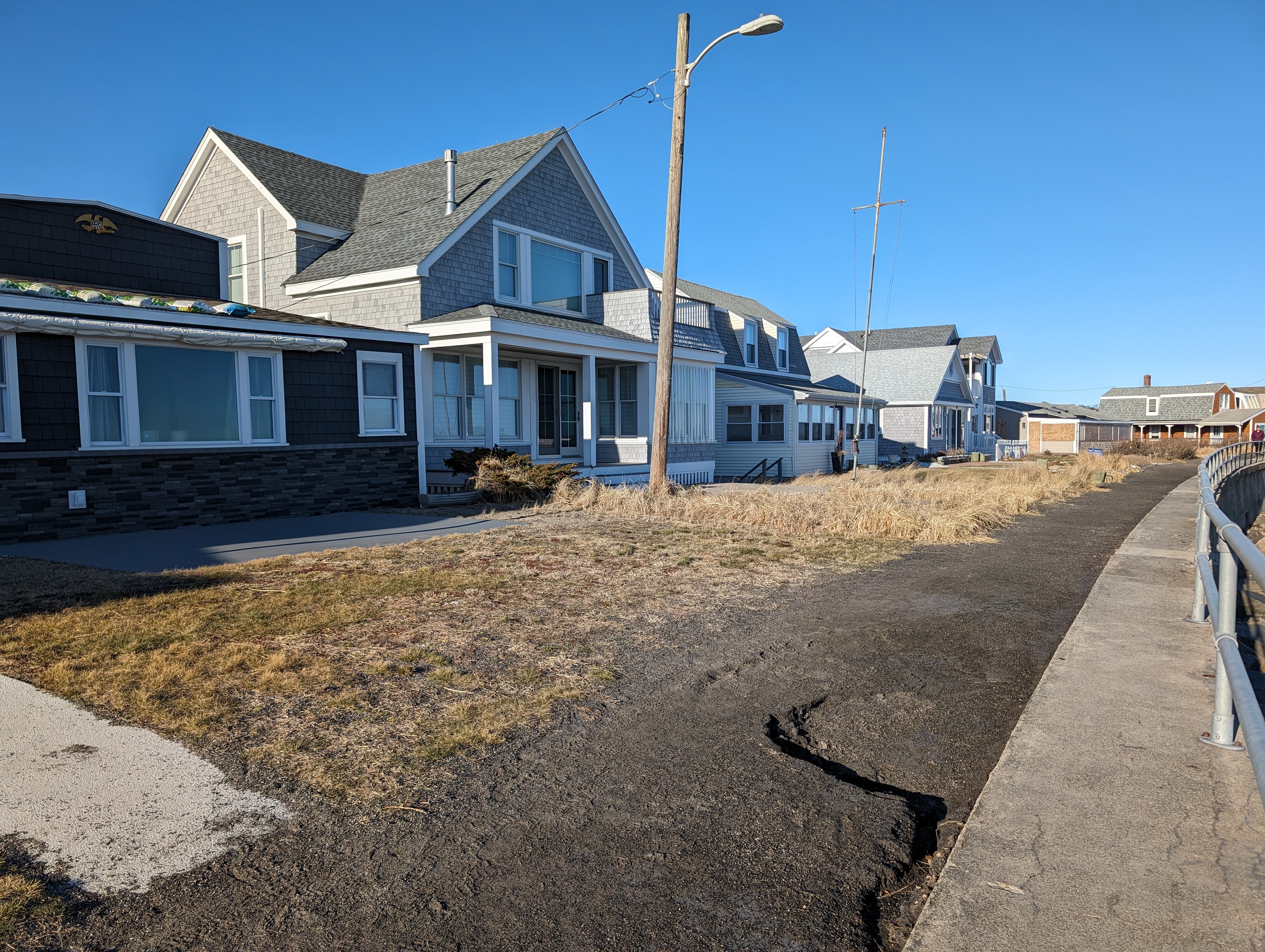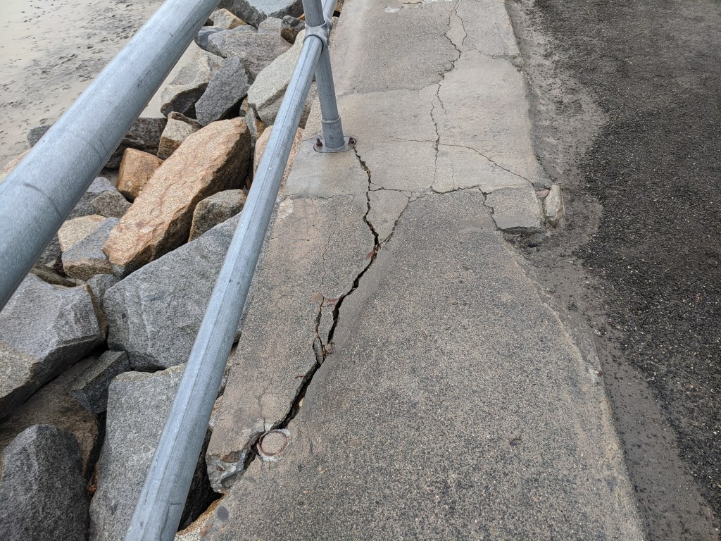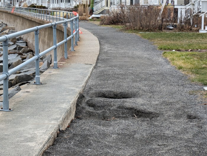 After a trio of March storms in 2018, the seawall pathway collapsed in two sections, revealing gaping chasms beneath (later filled). Fissures, cracks and seasonal pothole wear and tear were numerous. Thanks to immediate major repairs, the hollow underbelly sections were filled and packed down and the walkway widened pretty much the entire seawall. Rip rap boulders were shuffled into temporary pyres as extra wall support on the beach side.