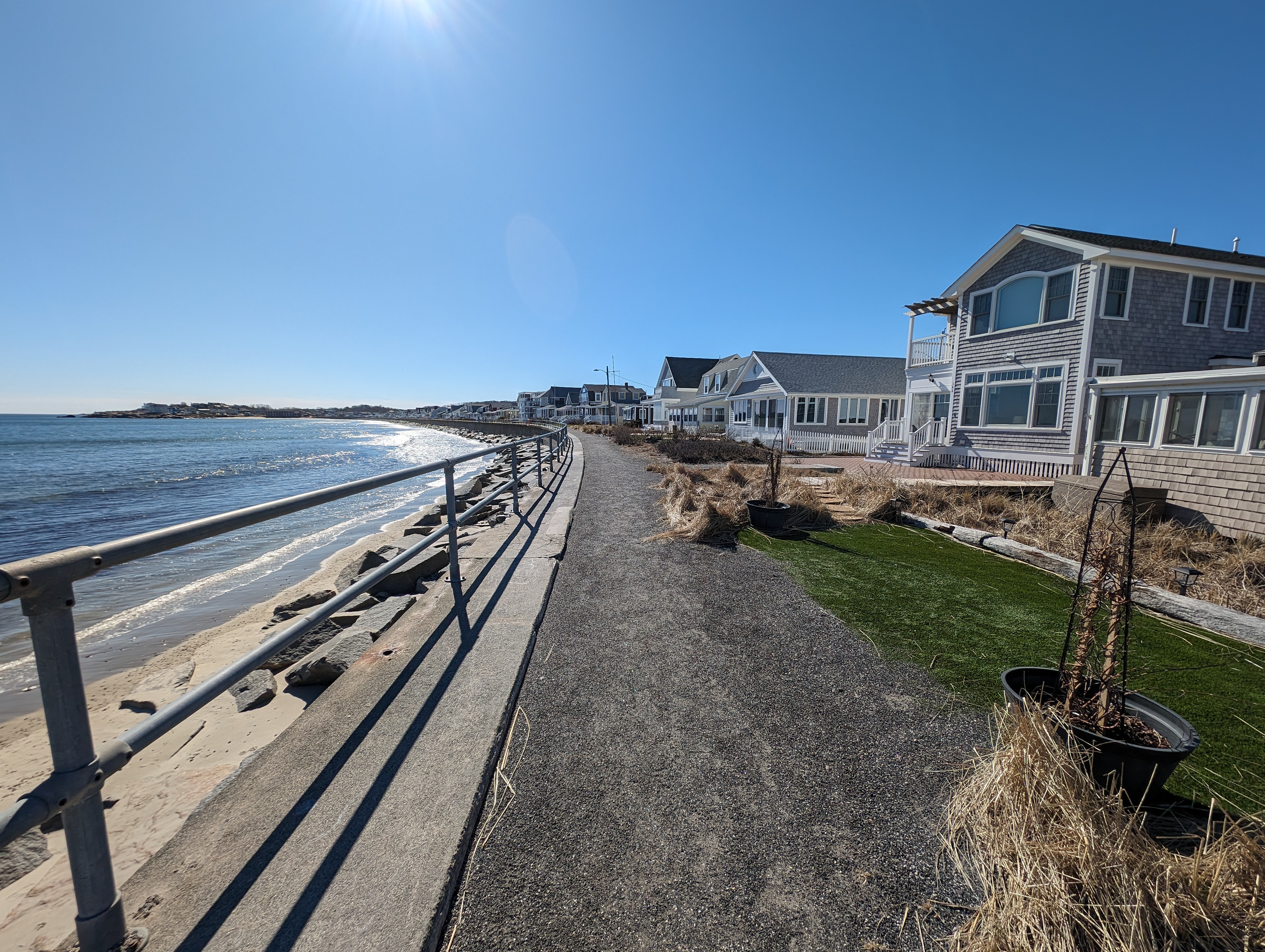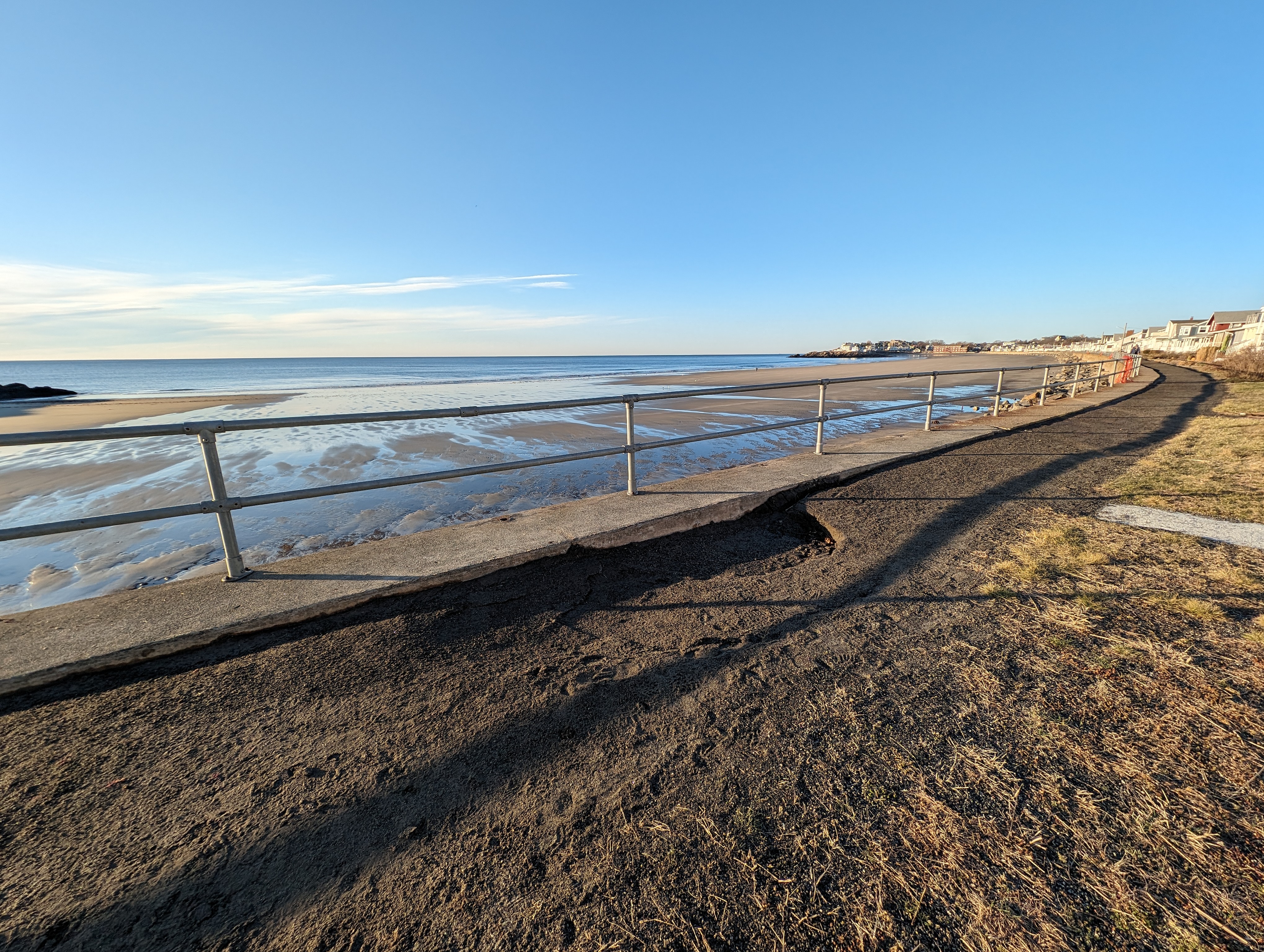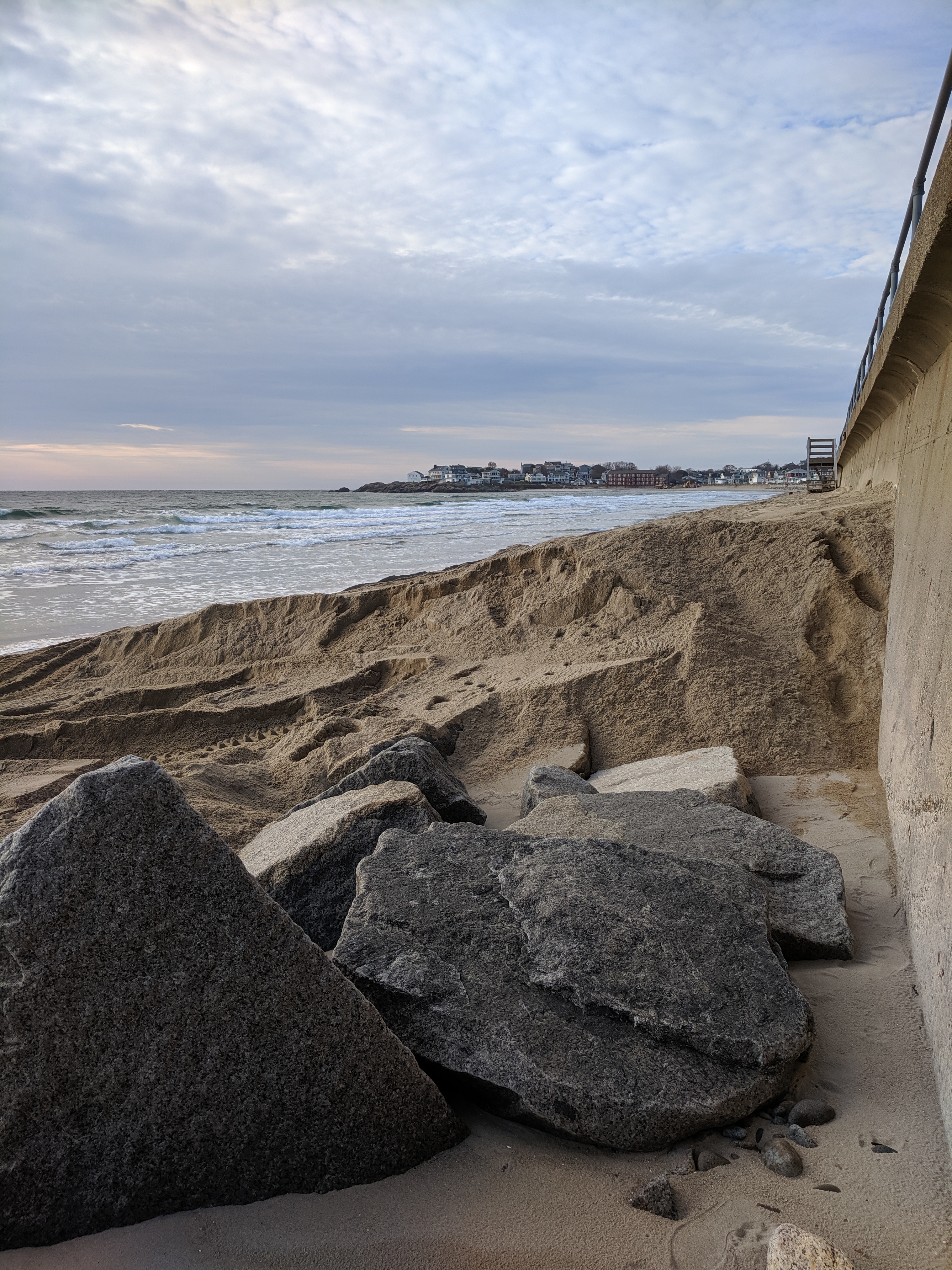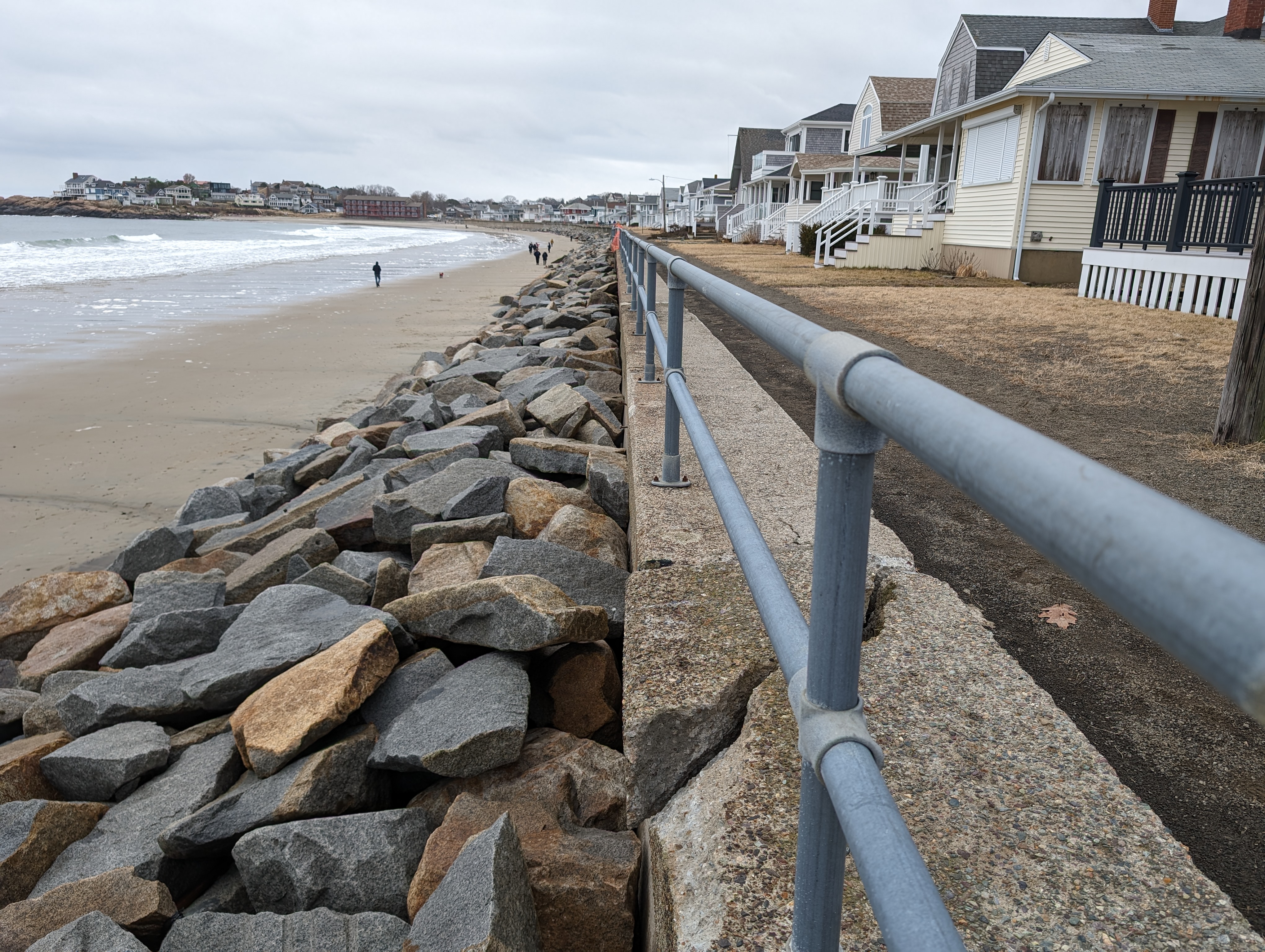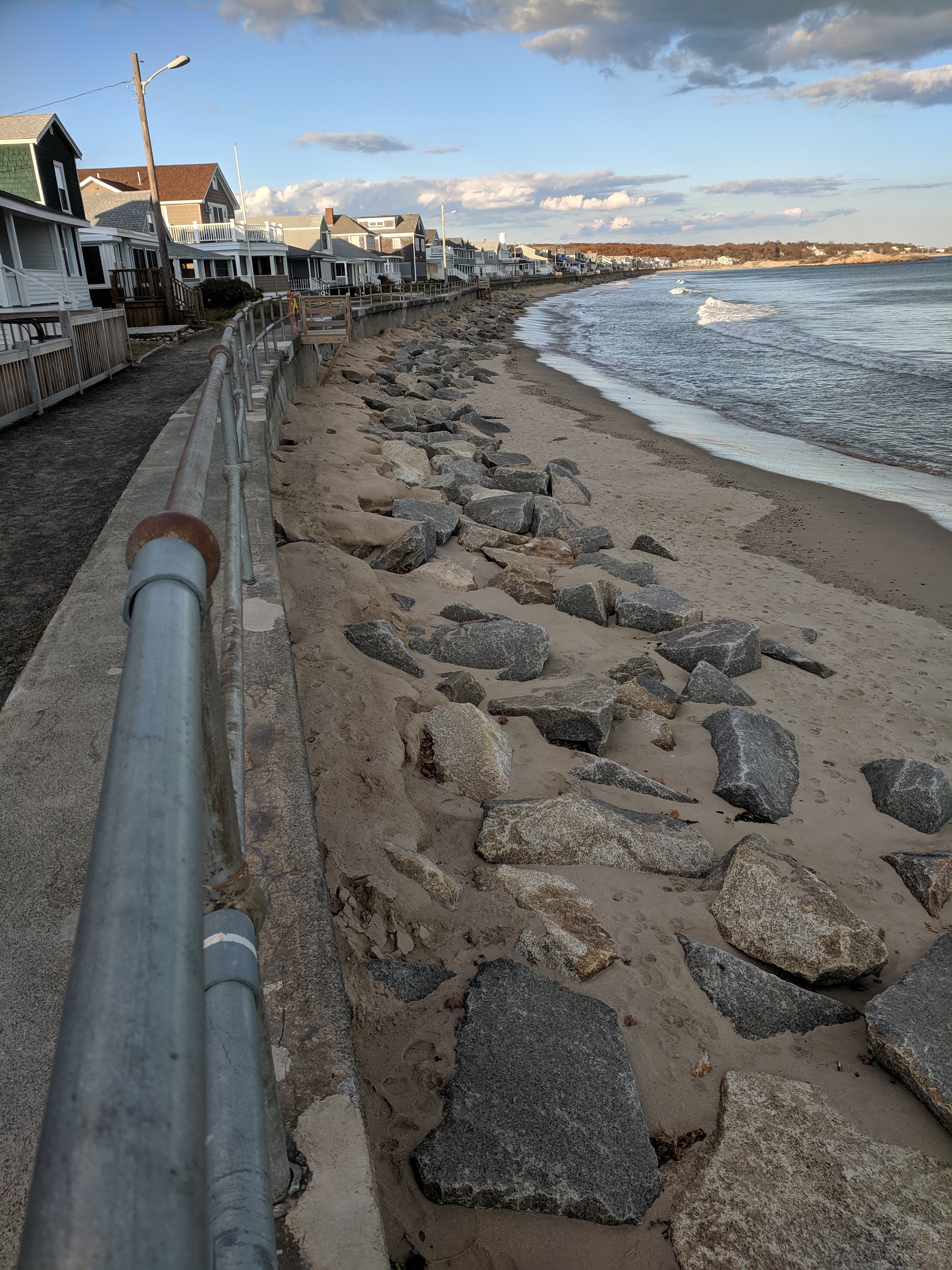 In 2019, hundreds of tons of boulders were added strategically, and later an impressive quantity of sand. Unsurprisingly the sand was devoured by tides and storms–even on the very day it was deposited, swept straight away. The rip rap–mostly unchanged–and new walkway have held.