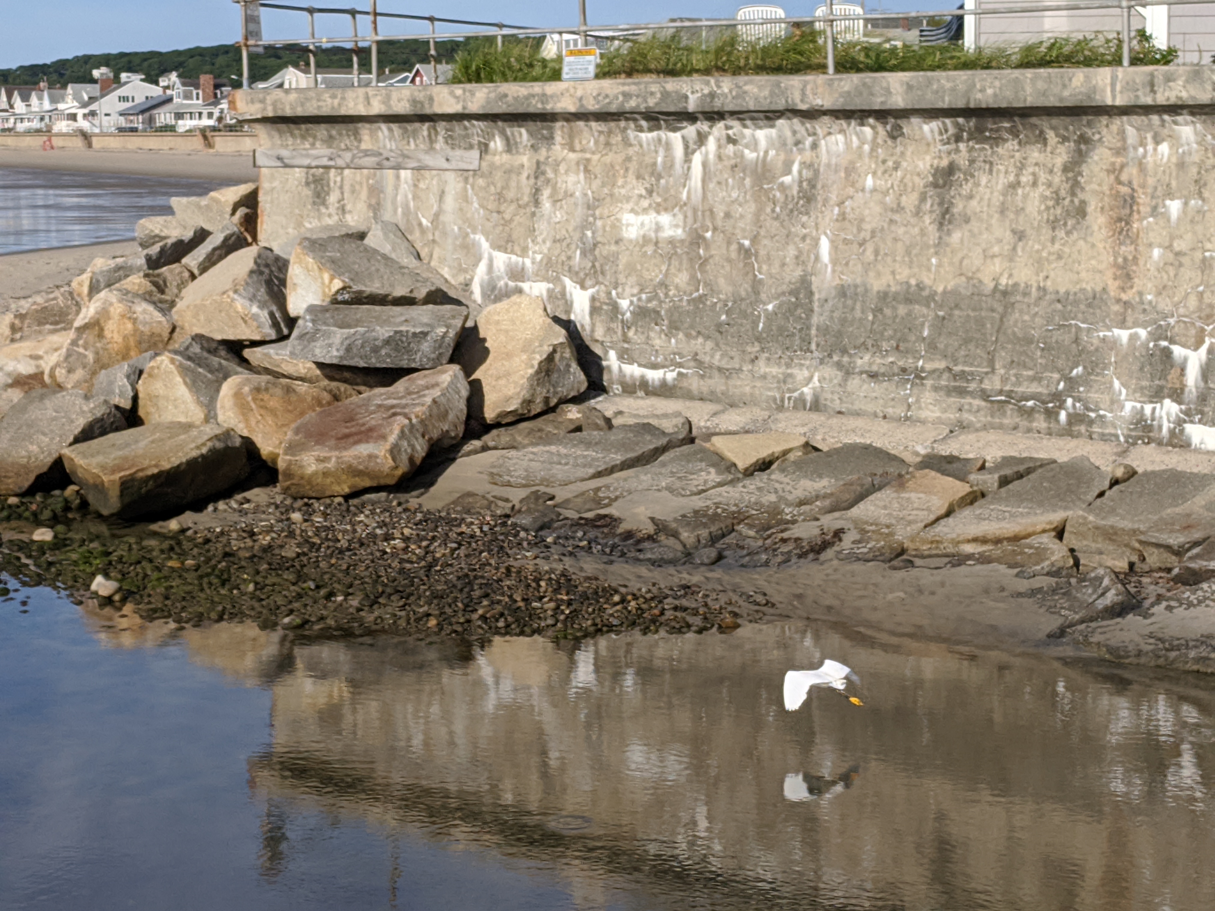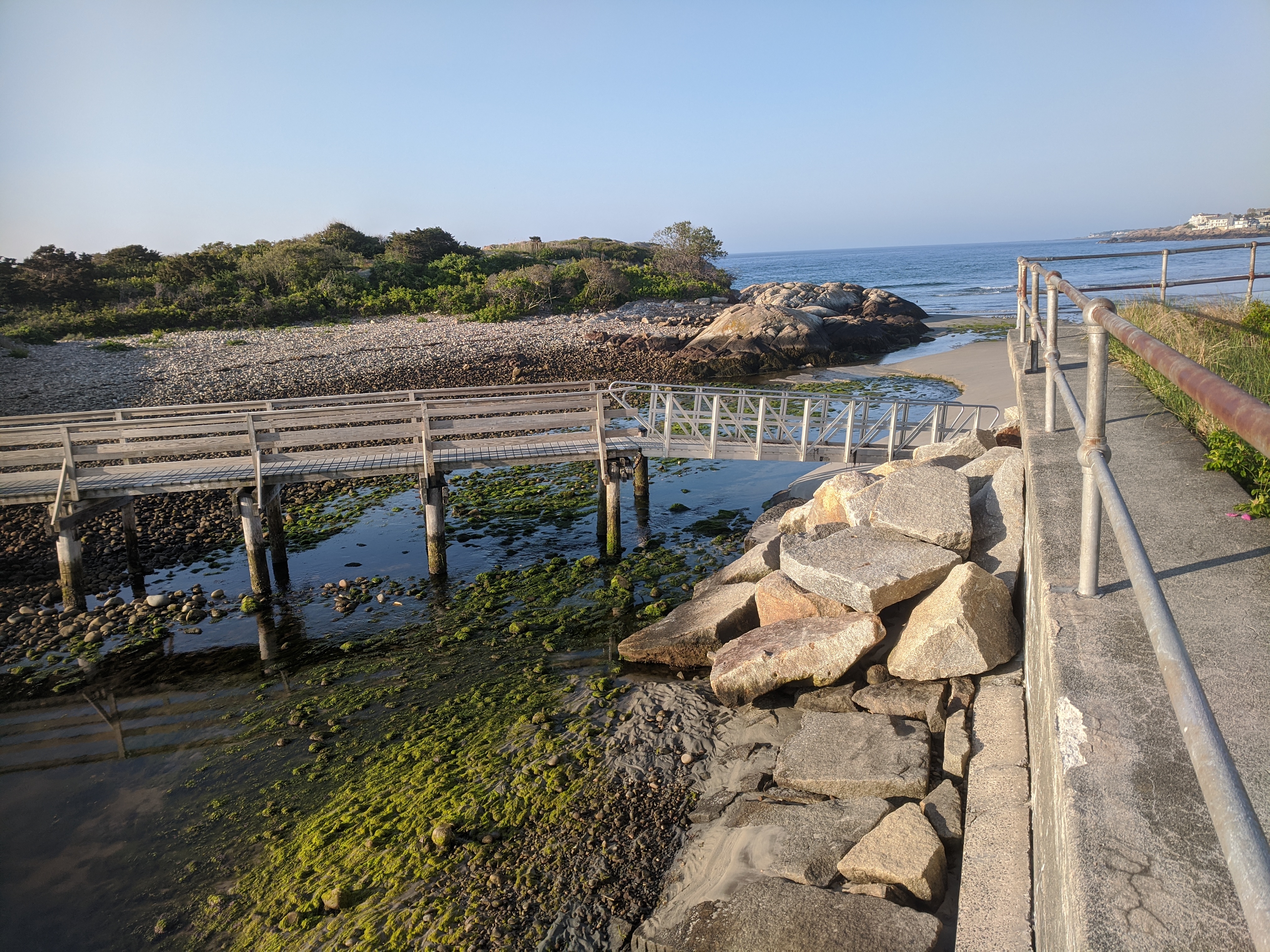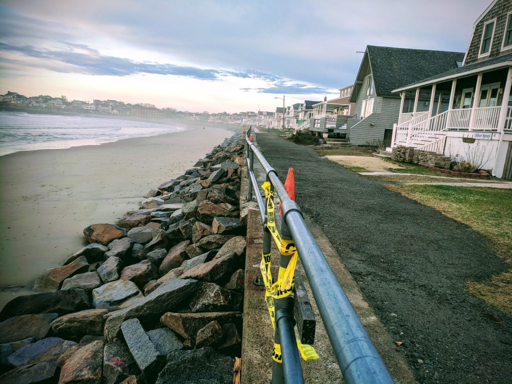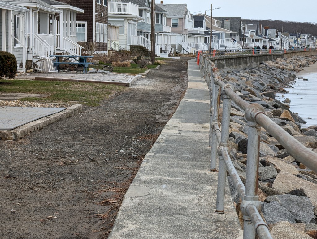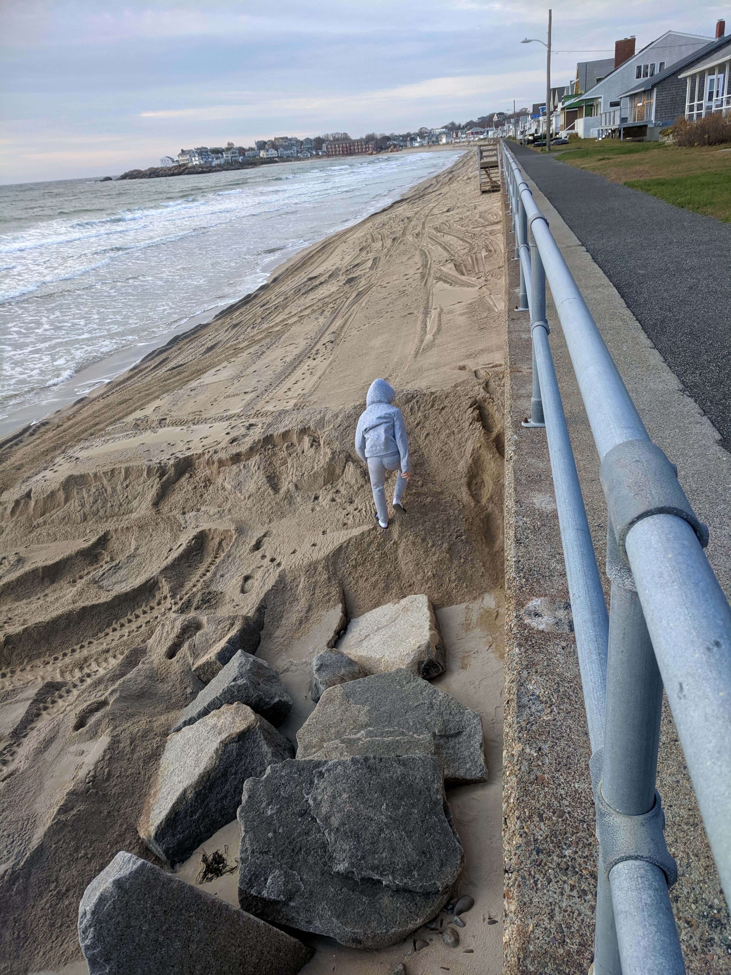 In 2019, hundreds of tons of boulders were added strategically, and later an impressive quantity of sand. Unsurprisingly the sand was devoured by tides and storms–even on the very day it was deposited, swept straight away. The rip rap–mostly unchanged–and new walkway have held.