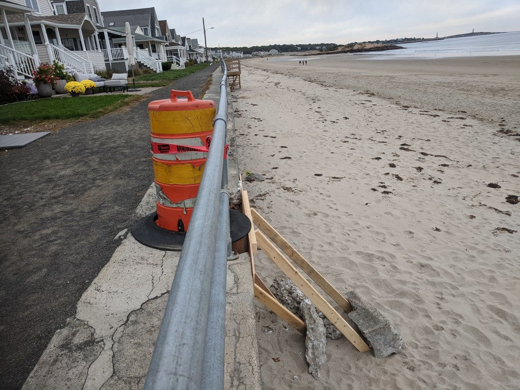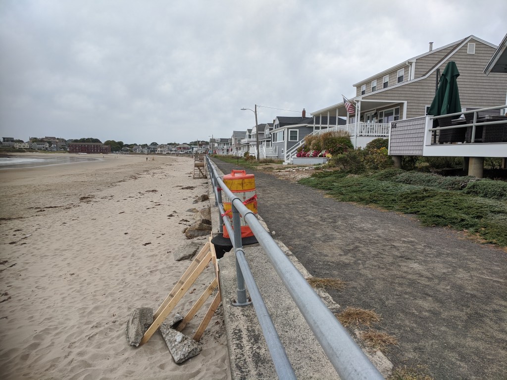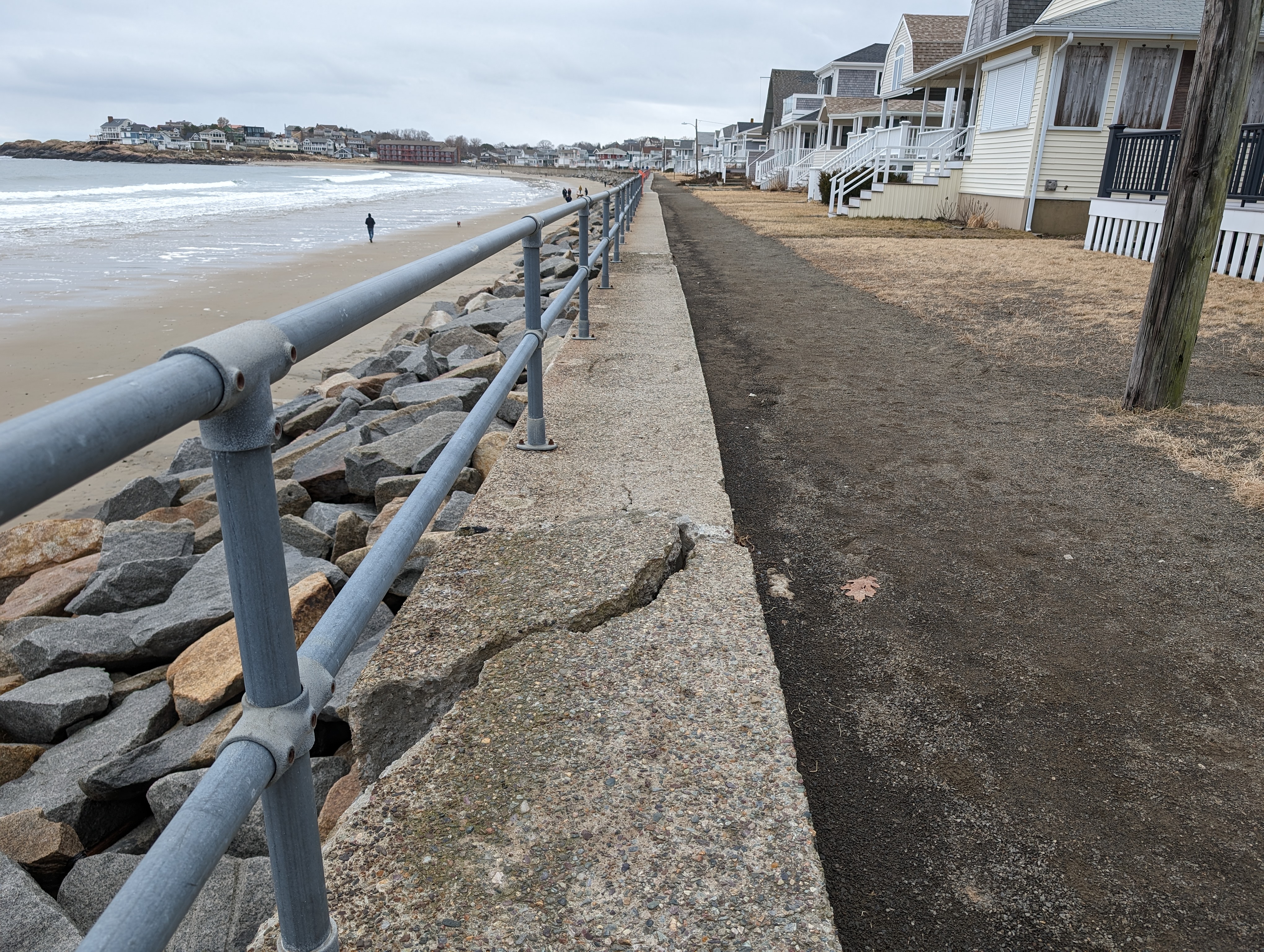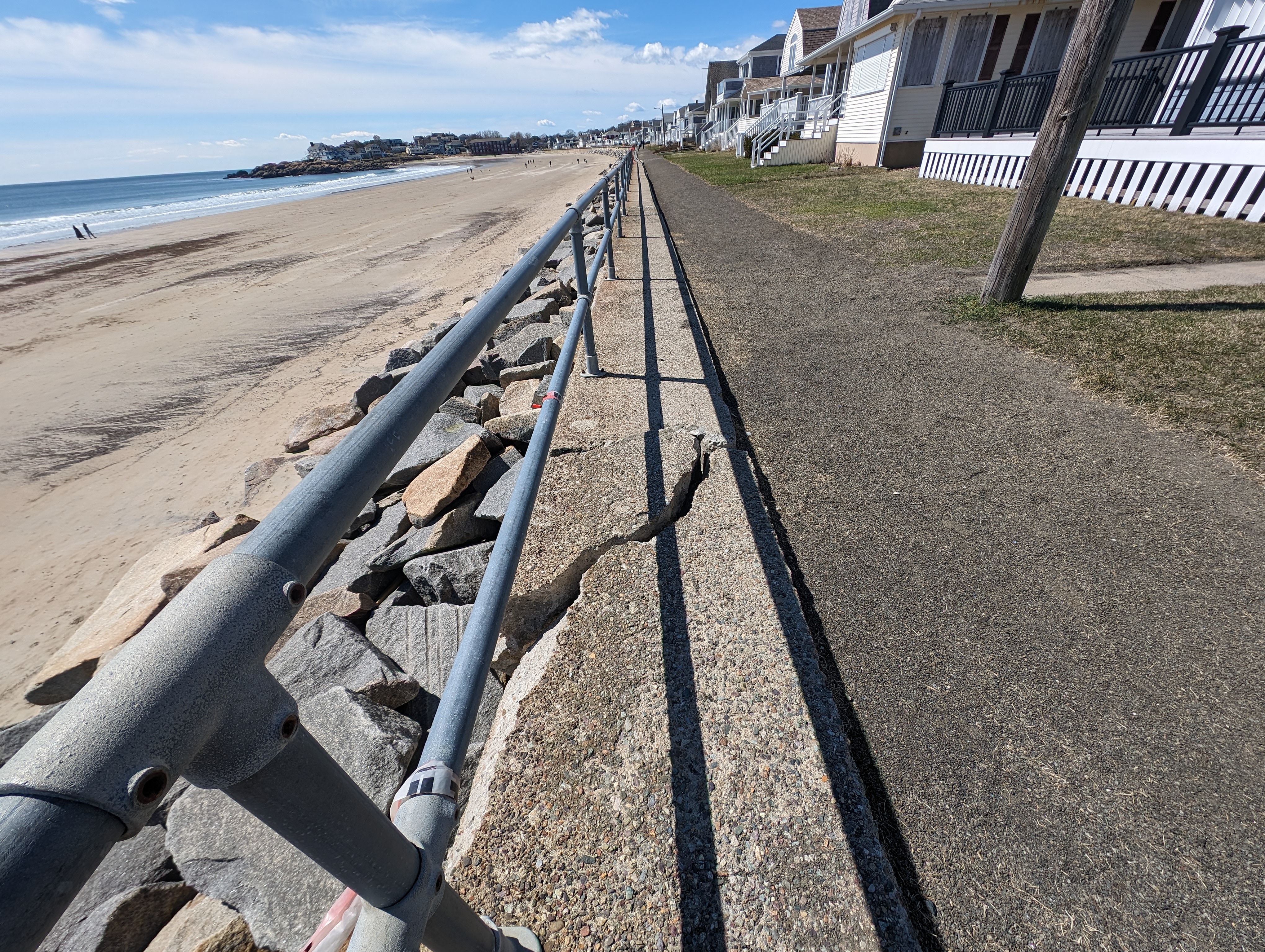Rockport DPW does annual maintenance. I can’t find updated plans and diagrams about the scope of the proposed next phase of the Long Beach seawall project, but will add them here if I do. Based on the estimated 2.8M award reported in the FEMA press announcement May 4, 2023 to be combined with the town’s match of 1.3M, perhaps it was solely repair and maintenance, and spots that had not been addressed in 2018 and 2019. It’s a long seawall! The 2020 schematic labels 350 feet of wall from roughly #58-#70 as damaged. After the path was tamped down, the bowing was visible.