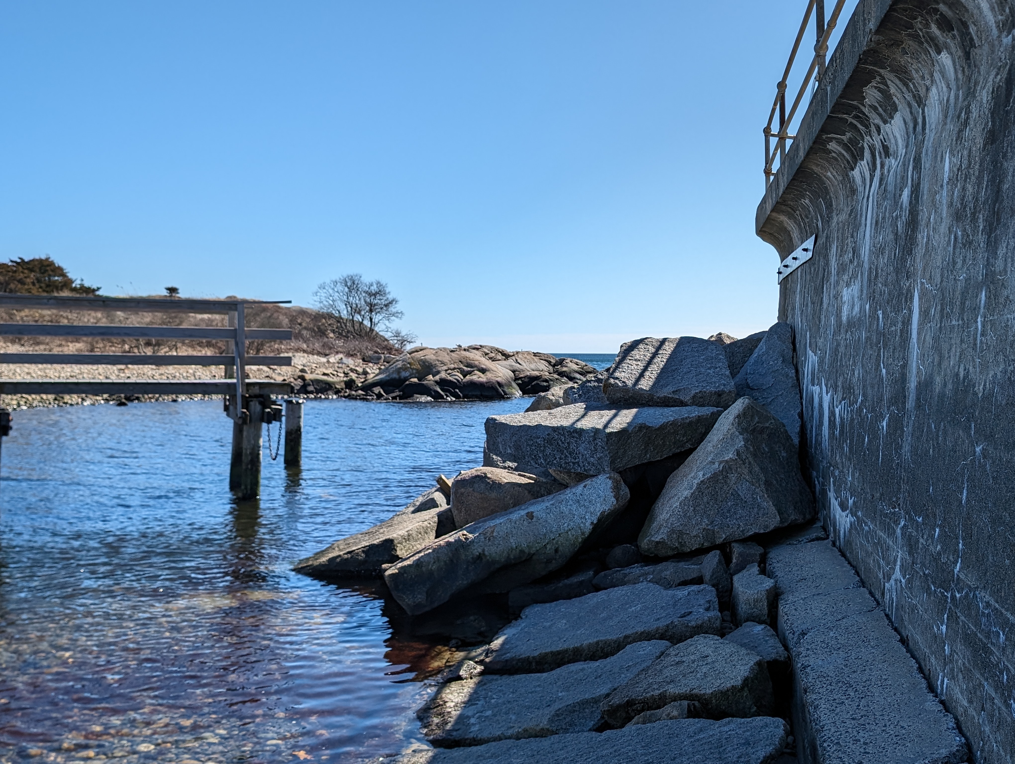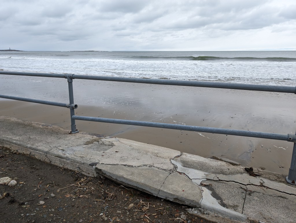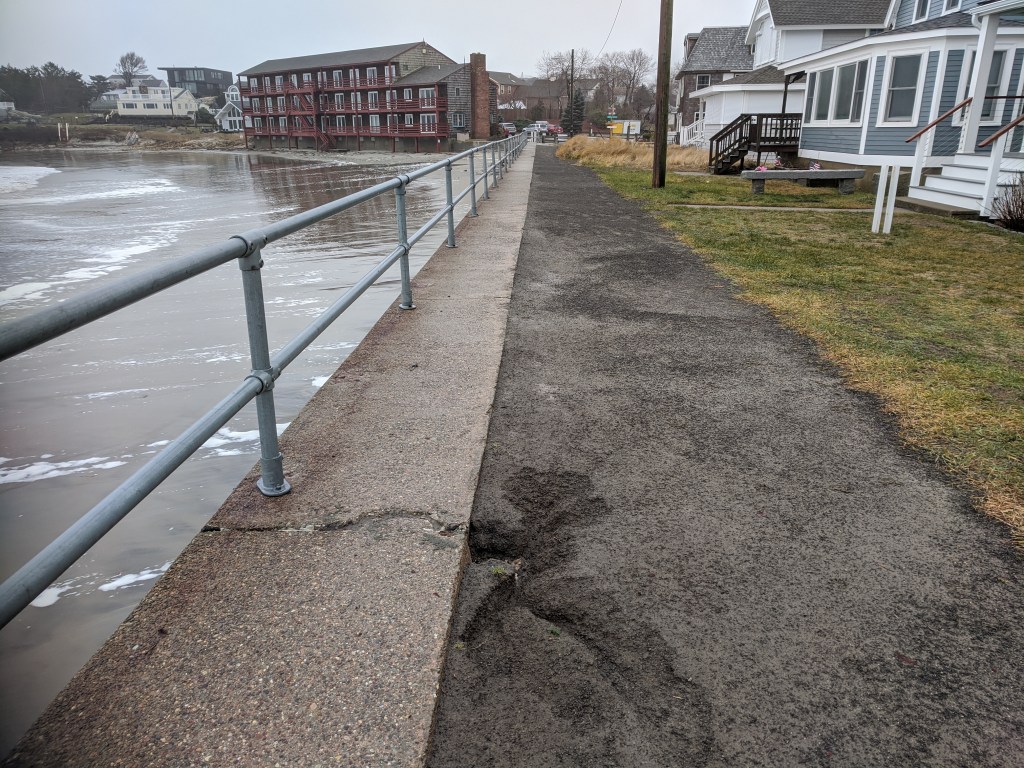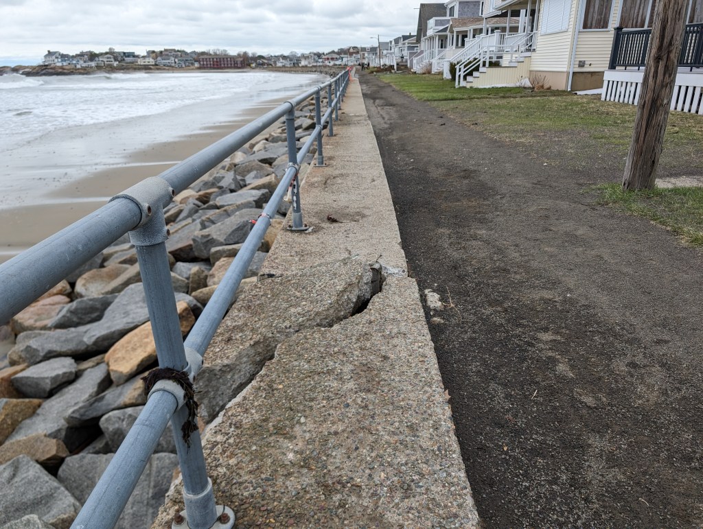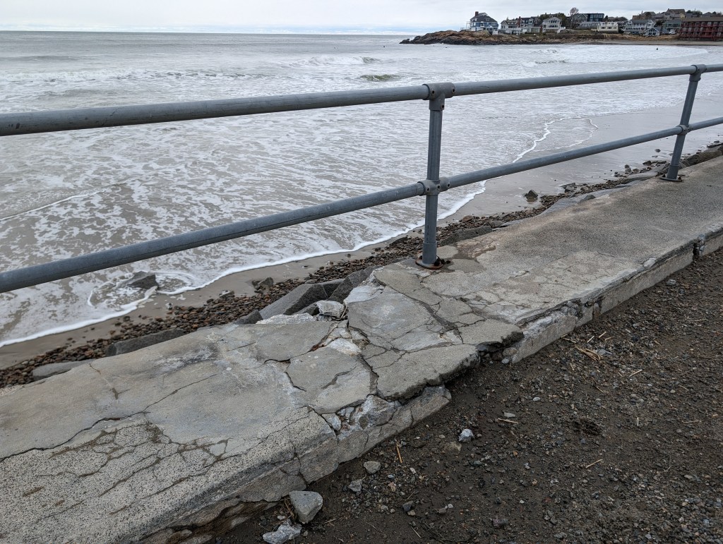 Rockport DPW does annual maintenance. I can’t find updated plans and diagrams about the scope of the proposed next phase of the Long Beach seawall project, but will add them here if I do. Based on the estimated 2.8M award reported in the FEMA press announcement May 4, 2023 to be combined with the town’s match of 1.3M, perhaps it was solely repair and maintenance, and spots that had not been addressed in 2018 and 2019. It’s a long seawall! The 2020 schematic labels 350 feet of wall from roughly #58-#70 as damaged. After the path was tamped down, the bowing was visible.