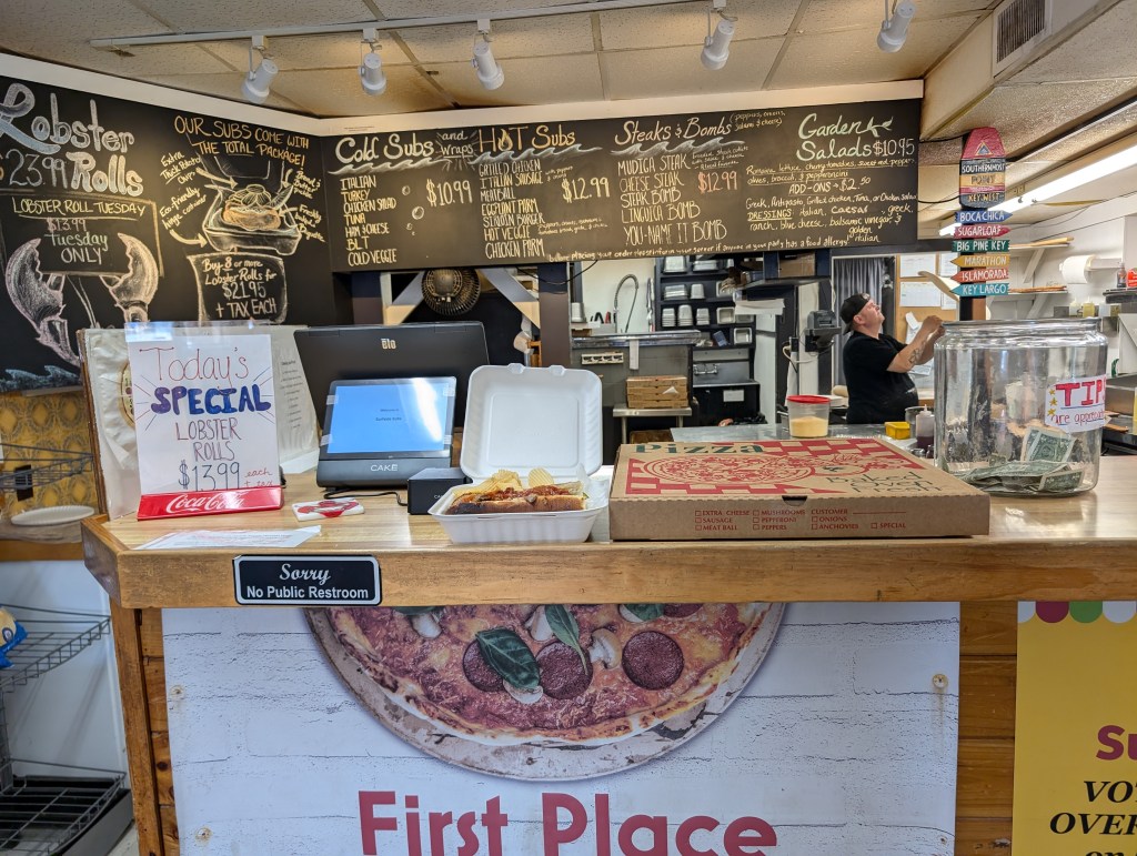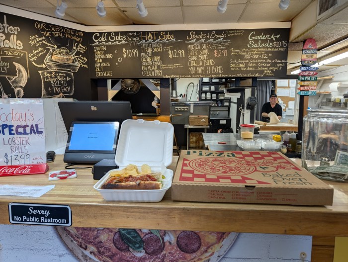 Customers lined up one fall day for mudiga steak subs, turkey subs, tuna salad, pizzas, and yes, lobster rolls, which are on special this week. Also pizza. Buy any pizza and get a second one for $5, scrumptious fresh and hot. Too much? When you’re cold and missing a Long Beach Surfside slice, you’ll be happy you bought an extra to wrap and freeze for later.