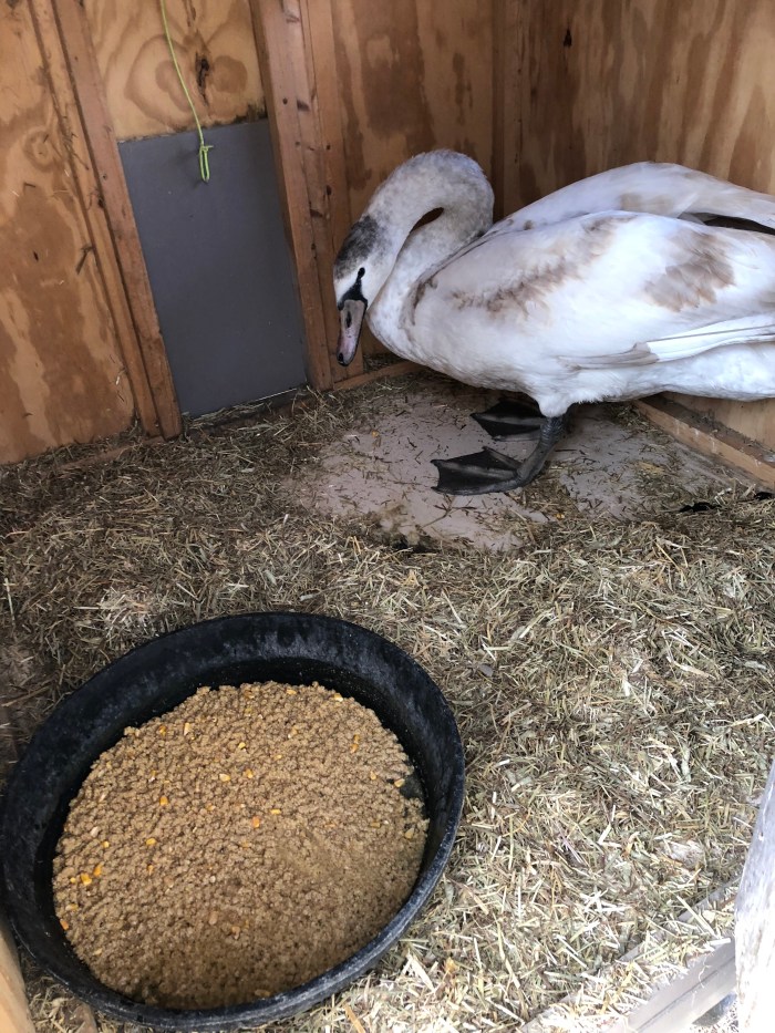 The Young Swan has had an eventful and productive first day in captivity. With much gratitude and thanks to Lyn for taking on the tremendous responsibility of caring for a wild swan for the winter. Our hope is that the Young Swan is a she, and that she will be re-released to Niles Pond this coming spring.