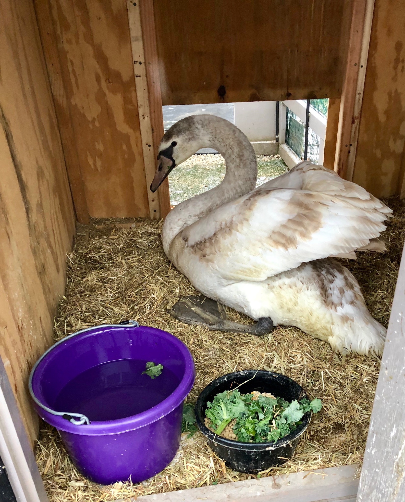 A friend of Lyn’s is donating three bales of hay. To supplement the pellets and corn Lyn has been feeding the swan, yesterday she purchased collard greens (which the Young Swan loved), spinach, and kale (yet to try).