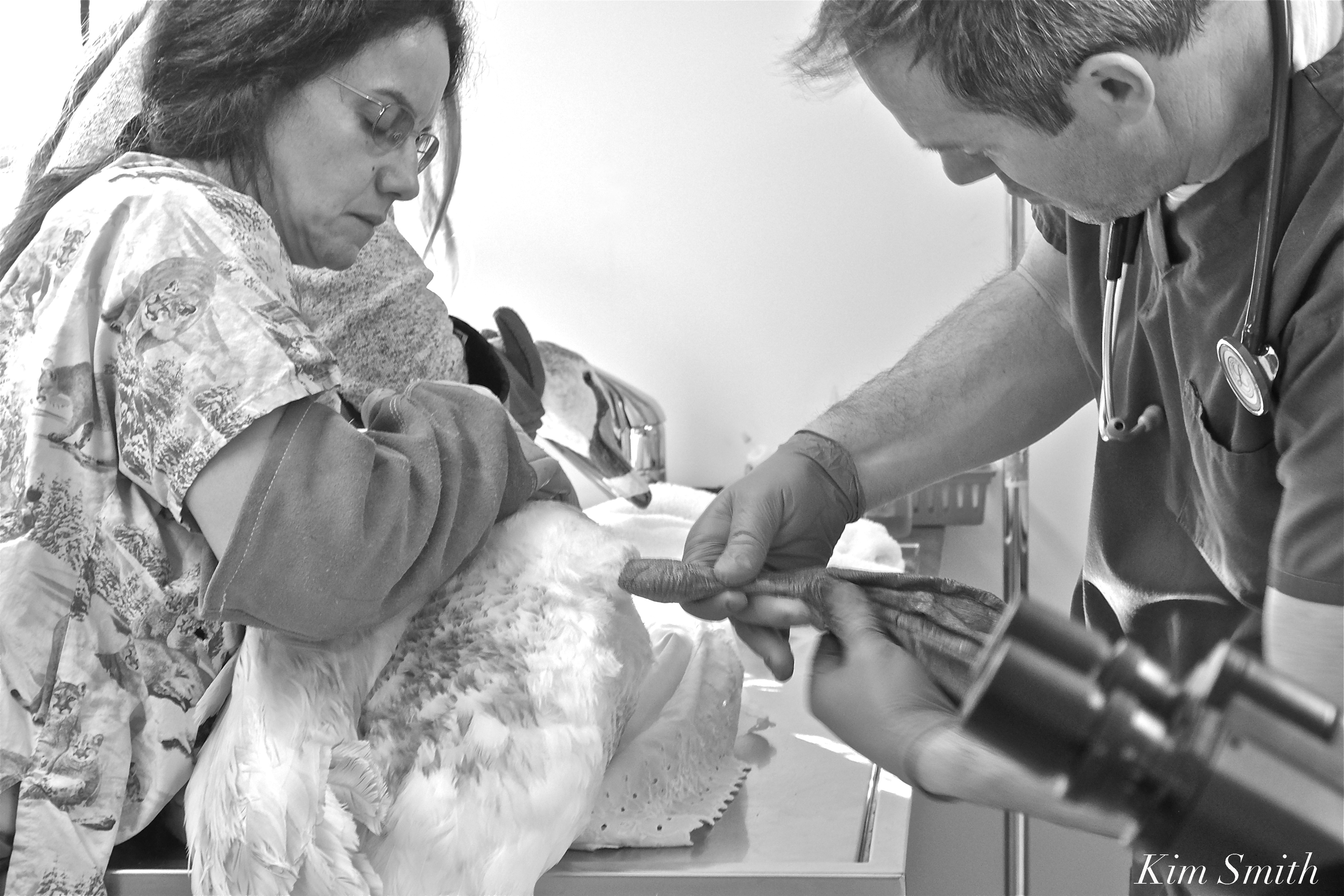 The Niles Pond Young Swan, rescued by Lyn Fonzo and Dan Harris on Friday, was taken to SeaPort Veterinary Hospital Saturday morning for a wellness checkup and because it is thought she may have contracted round worm at the shelter from where she originated. Dr. Cahill gave her a complete physical, checking on wings, feet, degree of fat on her bones, took an xray, and drew blood for a blood work up. His assistant also plucked a few feathers to send off to a lab to determine the sex of the young Mute Swan. It will take several weeks for the results of the tests, but based on Dr. Cahill’s visual assessment, she appears to be in excellent health!!