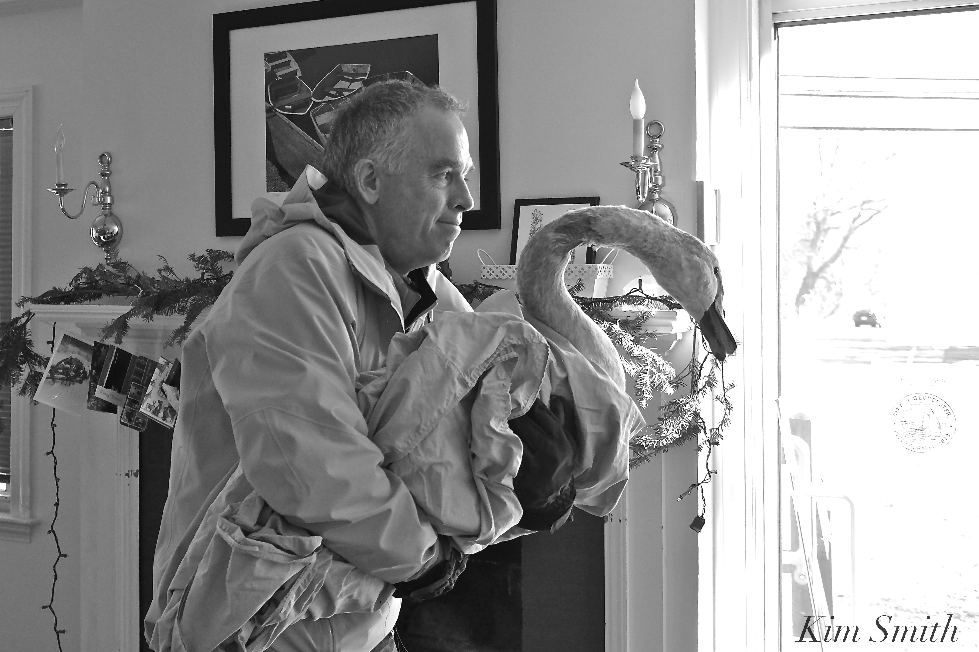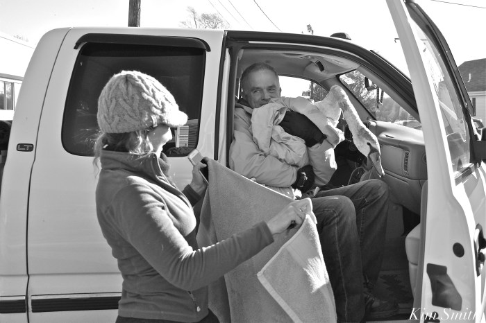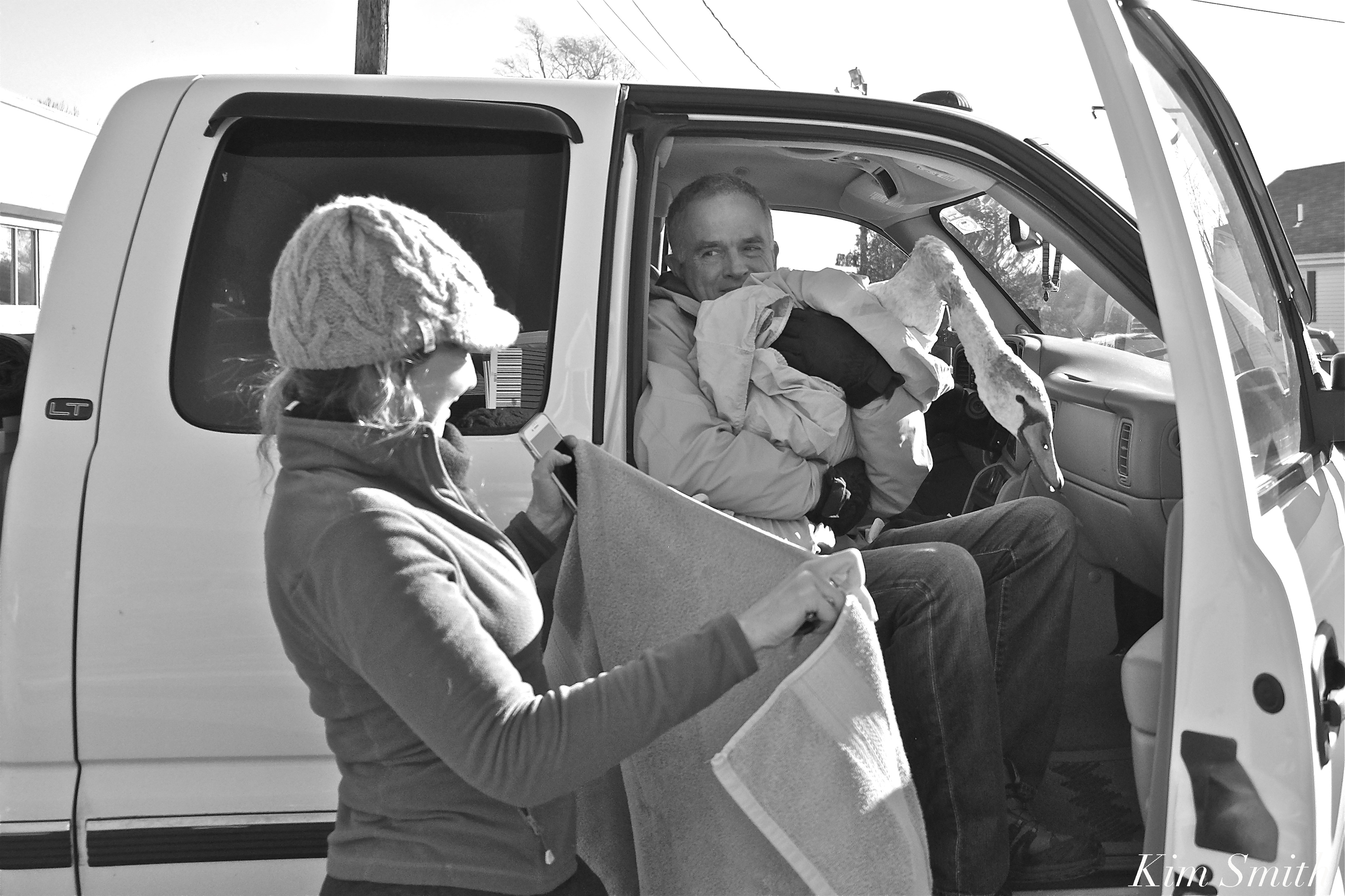 Extremely concerned about coyotes, Mr. Swan’s caretakers Lyn and Dan checked on him throughout the night. I took the dawn shift and found him alert and preening. He made several attempts to walk, but then would plop down and tuck his head under his wing to sleep and to keep warm. Eastern Point residents Duncan and Stephanie, and ice boat sailor Steven, offered to help while Lyn, Skip Munroe, Lois, and I conferred on the phone. We decided the best plan of action would be to capture him and return him to Rockport Harbor. At 9am Skip and Dan determined that the ice was okay to walk upon. They fearlessly walked onto the pond and at one point Lyn followed with blankets. After first attempting to capture him, they then herded him over near Skip Hadden’s dock. Skip, Skip, and Dan again tried to capture him. He’s a very smart swan, wily and wild, and after several unsuccessful attempts, we decided to not tire him out and try to feed him, and help him as much as he would allow, from Lyn’s little beach.
