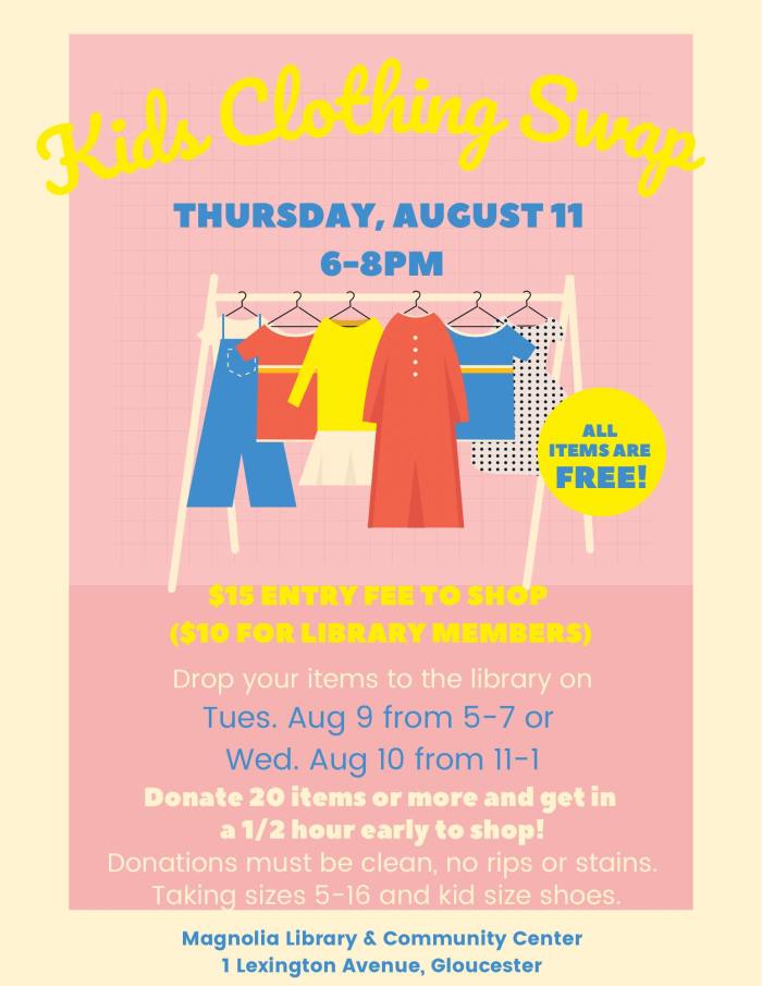 We hope you will consider donating your kiddos clothes that they no longer wear for our Clothing Swap! We are taking donations Aug 9th 5-7 and 10th 11-1 in the library. Then pay just $15 to get in and ‘shop’ for free! Members save $5. Donate 20 or more items and get in at 4:30.