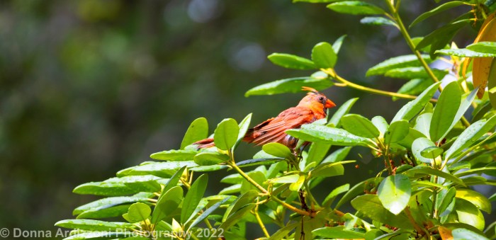 Papa Cardinal is always first on the scene in the morning, scoping his territory for potential danger. His feathers are mottled because at this time of year, like many songbirds, Cardinals are molting.