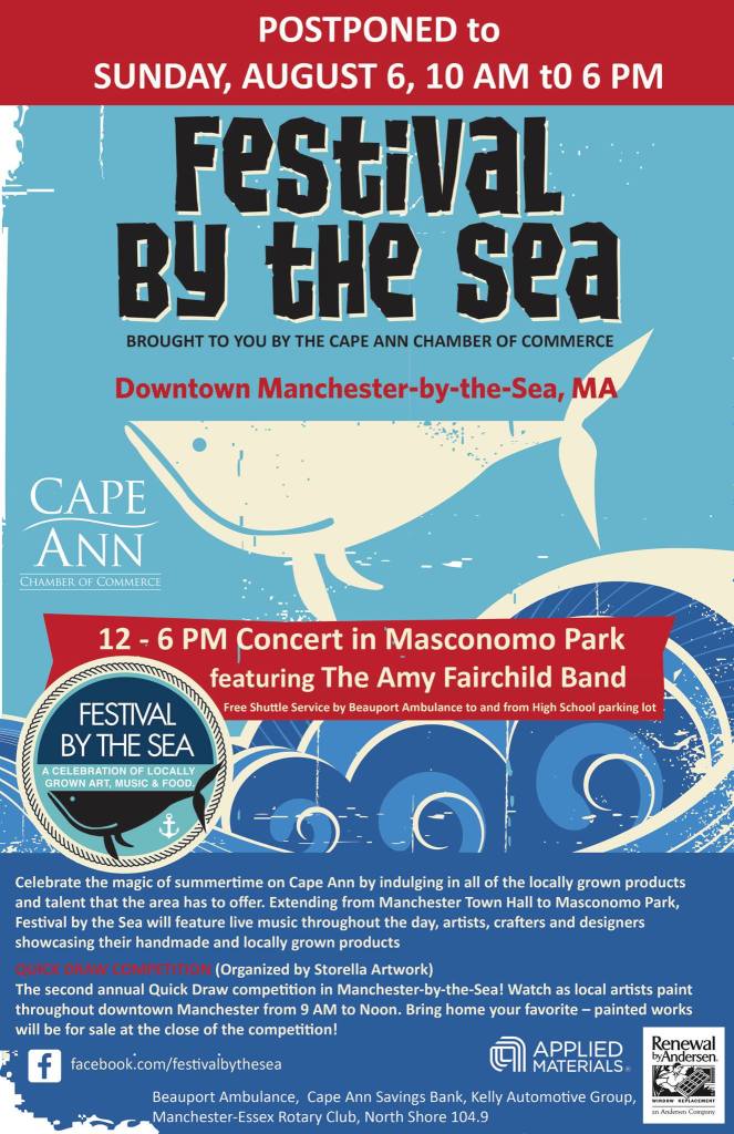 Due to the weather forecast for Saturday, Festival by the Sea has been postponed and will be held on Sunday, August 6! Sunday looks to be a GORGEOUS day – we look forward to seeing you all in Manchester-by-the-Sea on SUNDAY!