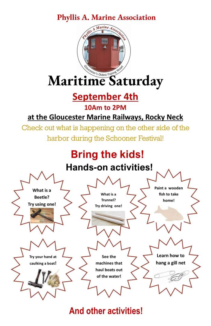 Looks like the weather is going to be gorgeous Saturday! Hope you will come over to the Railways to see what is happening. Great views of the harbor and the Schooner Festival from the Gloucester Marine Railways dock!