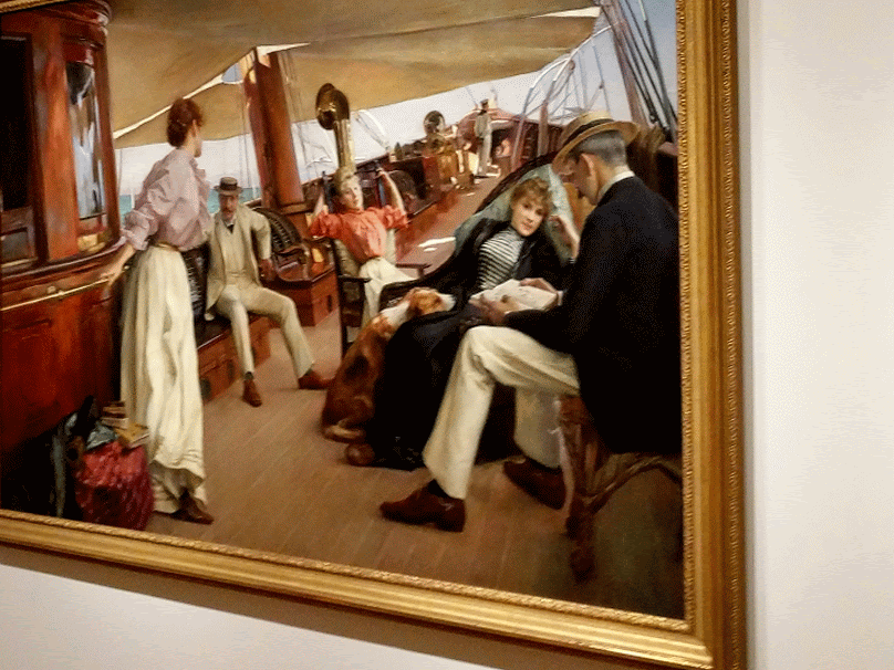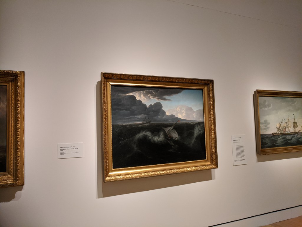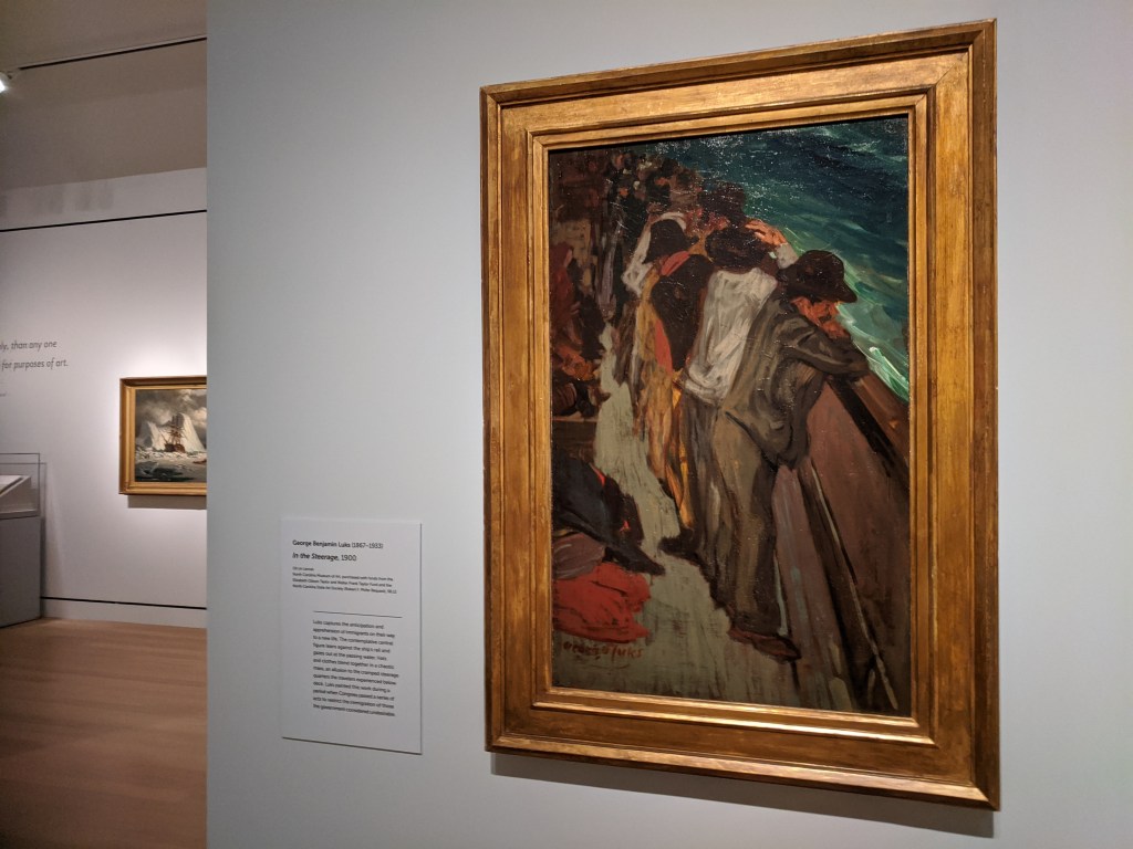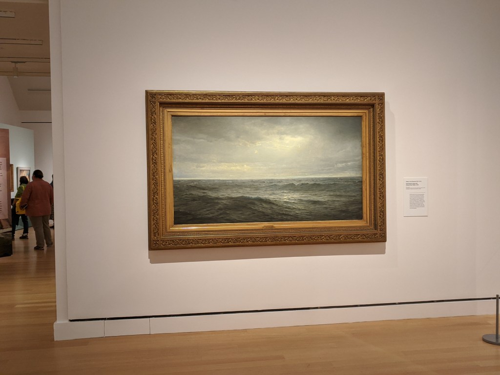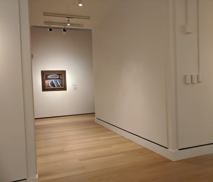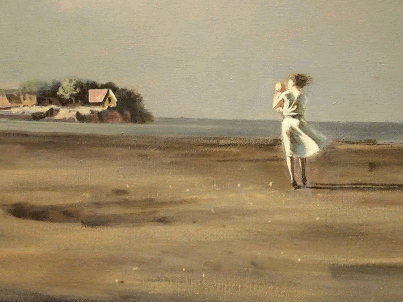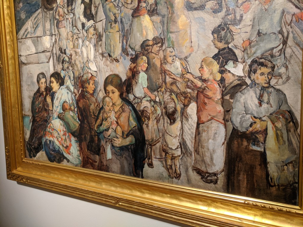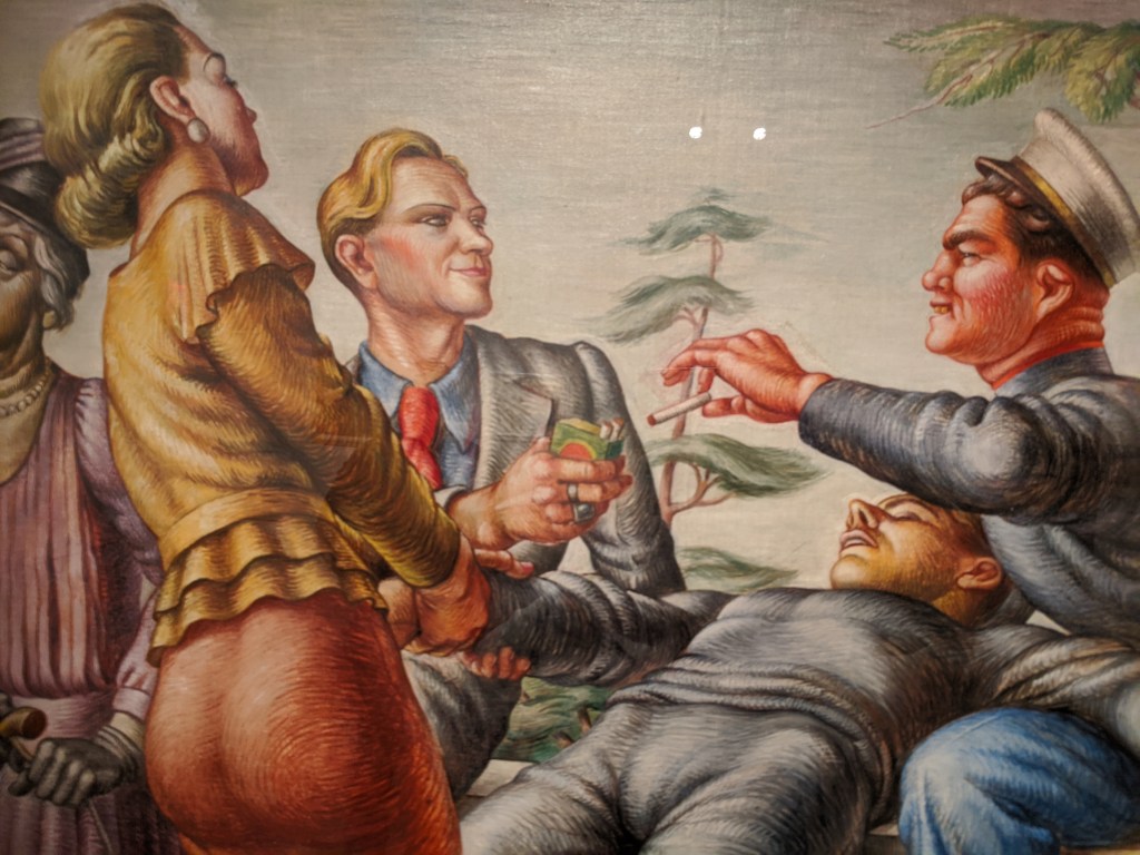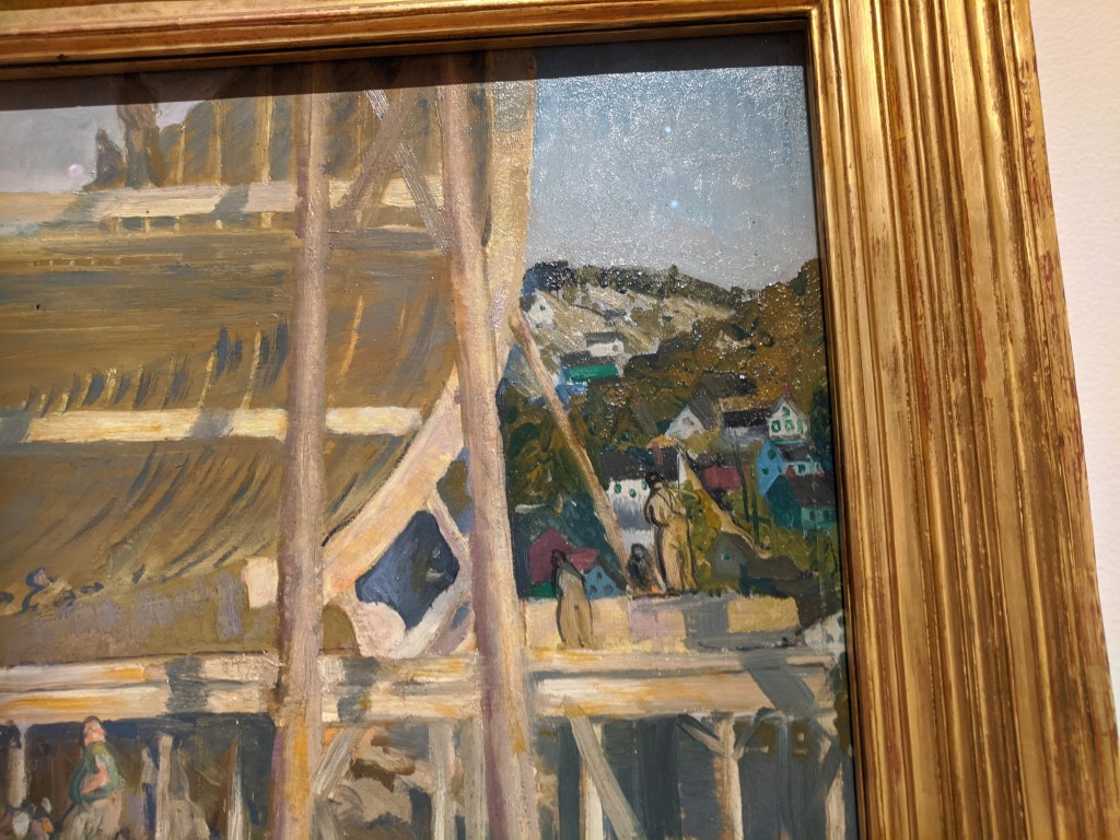 The letters in the band of green on the black flag spell “Romany Marie”, the name of restaurants owned by Marie Marchand, an immigrant from Romania. Her modest bistros and support were safe harbor for creatives whether serving just one customer or impromptu salons. Many of her habitual customers, like Davis, ascended to the top of their field. Davis painted a watercolor portrait of her in 1912 when he was 20 years old. He painted Flags 19 years later, a full generation spent building into his voice and career, much of it split oscillating between New York City and Gloucester. In 1928-29 he spent a momentous year+ studying abroad in Paris and married his first wife. The trip was made possible thanks to Gertrude Vanderbilt Whitney. The painting hints of memories and impressions of all three cities: Gloucester, Paris, and New York.