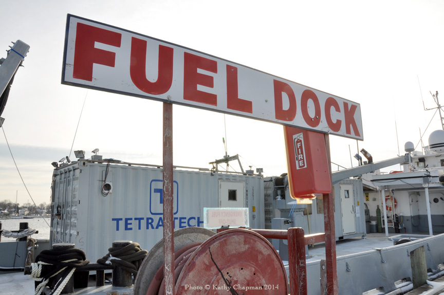 Ed Wayman (pictured) mans the fuel station at the Gloucester Marine Railways as Captain Christian and crew top off their lobster boat,Catherine M.