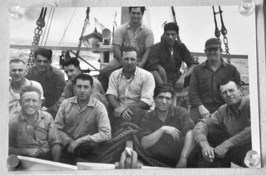 This is part one of a two or three part series on the family business Felicia Oil, located in Gloucester’s Fort. The first installment focuses on Sam Nicastro, Captain of the Trawler Felicia. He is pictured standing with her in 1948 at Fiesta and onboard landing a mako shark. In the second photo, Sam is in the first row, second from the left, aboard  Captain Joe Ciaramitaro’s boat, the Benjamin C. At that time there were over 200 boats in the Gloucester fleet.