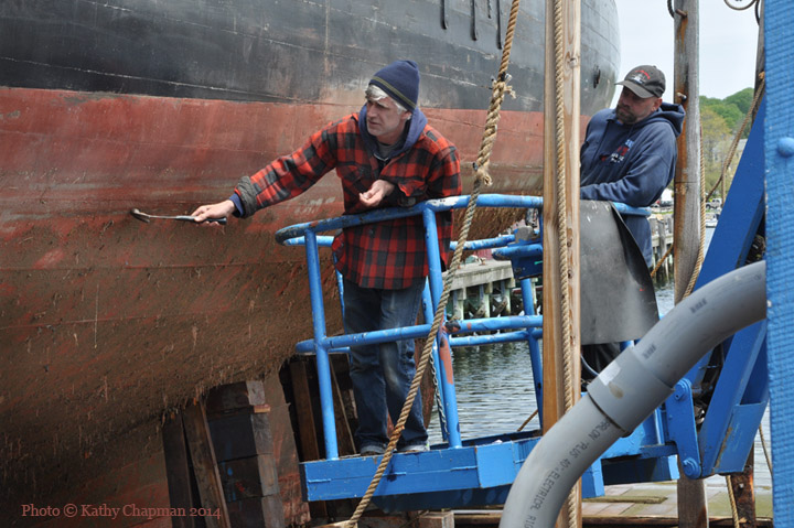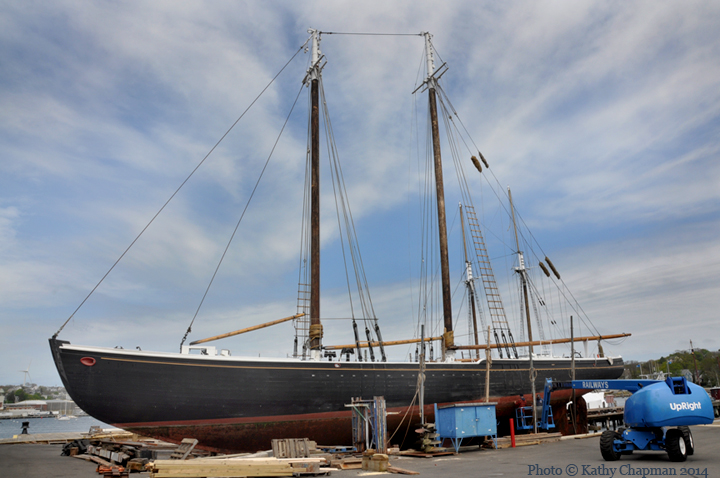 Kathy and Marty were back at the Gloucester Marine Railways this week to check out the Schooner Adventure with Restoration Coordinator Geoff Deckebach. Caulking and other repairs and improvements are underway as the restoration of Gloucester’s flagship continues.