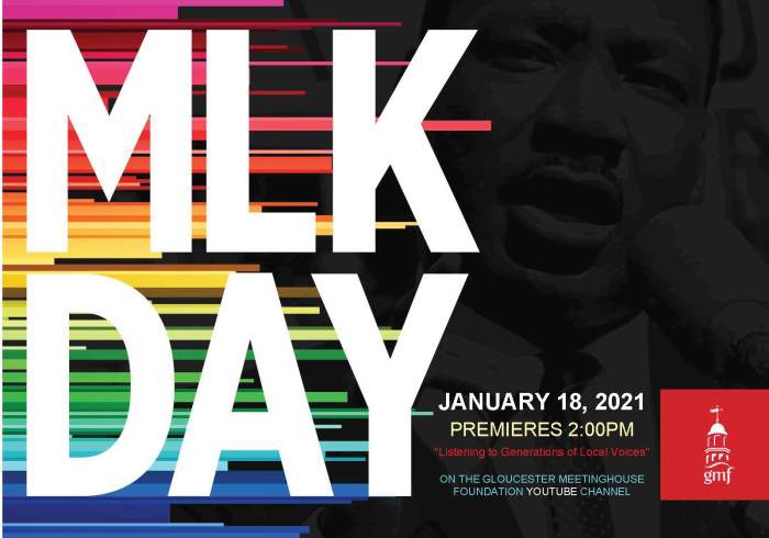 The Gloucester Meetinghouse Foundation celebrates the 2023 Martin Luther King, Jr. Day with a free event Monday, January 16 at 2:00 p.m. at the Gloucester Meetinghouse at the corner of Middle and Church Streets.