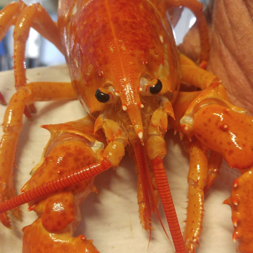 Our lobsterman Mike Tufts catches a rare orange#lobster. If we didn’t shoot the video to show it moving and alive you’d think it was cooked. He returned it to the sea once he let us shoot the video.