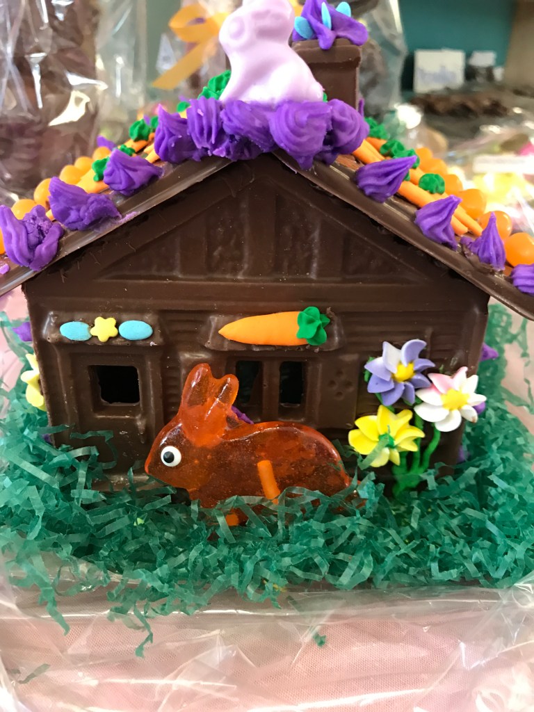At beautiful bunny cottage! The charming bunny houses at Nichols Candy House were made by Diane P. Don’t you love her imaginative details? Notice even the tiny blue eggs on the window frame and chimney