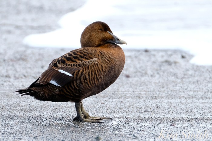 A sleepy-eyed female Common Eider was peacefully resting on the beach. I know she was okay because on our way back she slipped back into the surf.