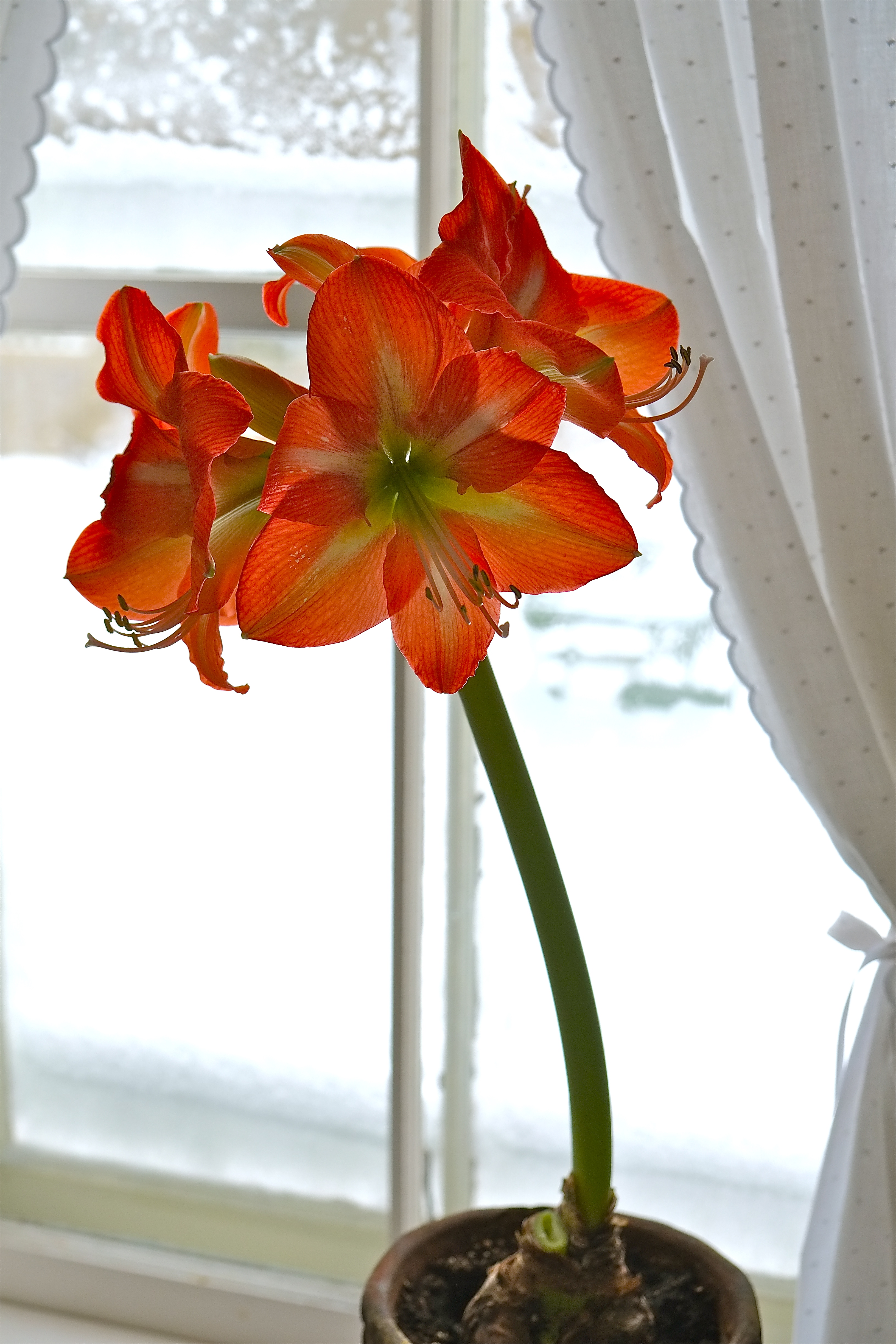 Perhaps the popularity of the amaryllis is due both to their ease in cultivation and also for their ability to dazzle with colors of sizzling orange, clear reds and apple blossom pink. My aunt has a friend whose family has successfully cultivated the same bulb for decades. For continued success with an amaryllis, place the pot in the garden as soon as the weather is steadily warm. Allow the plant to grow through the summer, watering and fertilizing regularly. In the late summer or early fall and before the first frost, separate the bulb from the soil and store the bulb, on its side, in a cool dry spot—an unheated basement for example. The bulb should feel firm and fat again, not at all mushy. After a six-week rest, the amaryllis bulb is ready to re-pot and begin its blooming cycle again. Excerpt from Oh Garden of Fresh Possibilities! ~ Coaxing Winter Blooms