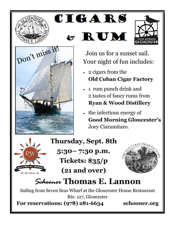 For less than the price of regular ticket aboard the Lannon you get two hand rolled Cigars from Paul Giacalone’s Old Cuban Cigar Company and three rum drinks Featuring Ryan and Wood’s Folly Cove Rum and a couple of rum samplings from Bobby Ryan’s private collection. $35 bucks gets you two hand rolled cigars three rum drinks AND your sail aboard the Lannon. No brainer, right??? Call Kay at 978-281-6634