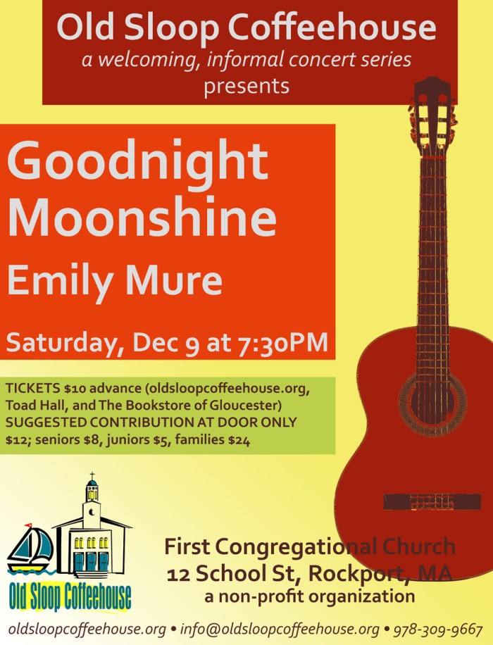All tickets will be refunded. Credit card charges will be refunded. If you bought tickets at The Bookstore in Gloucester or Toad Hall Bookstore, please return to that store for your refund. If you have questions, write to info@oldsloopcoffeehouse.org or call