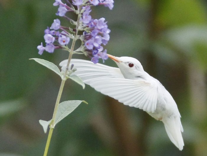 A true albino hummingbird, as is the above bird, has snowy white plumage and it’s eyes, legs, and bill are pink. True albinos are extraordinarily rare. Leucistic hummingbirds are still rare but are seen more often than true albions. Like the common Ruby-throated Hummingbird, leucistic forms have black, feet, bills, and eyes, but their feathers are some version of white, gray, buffy, and tan; not the typical shades of green.