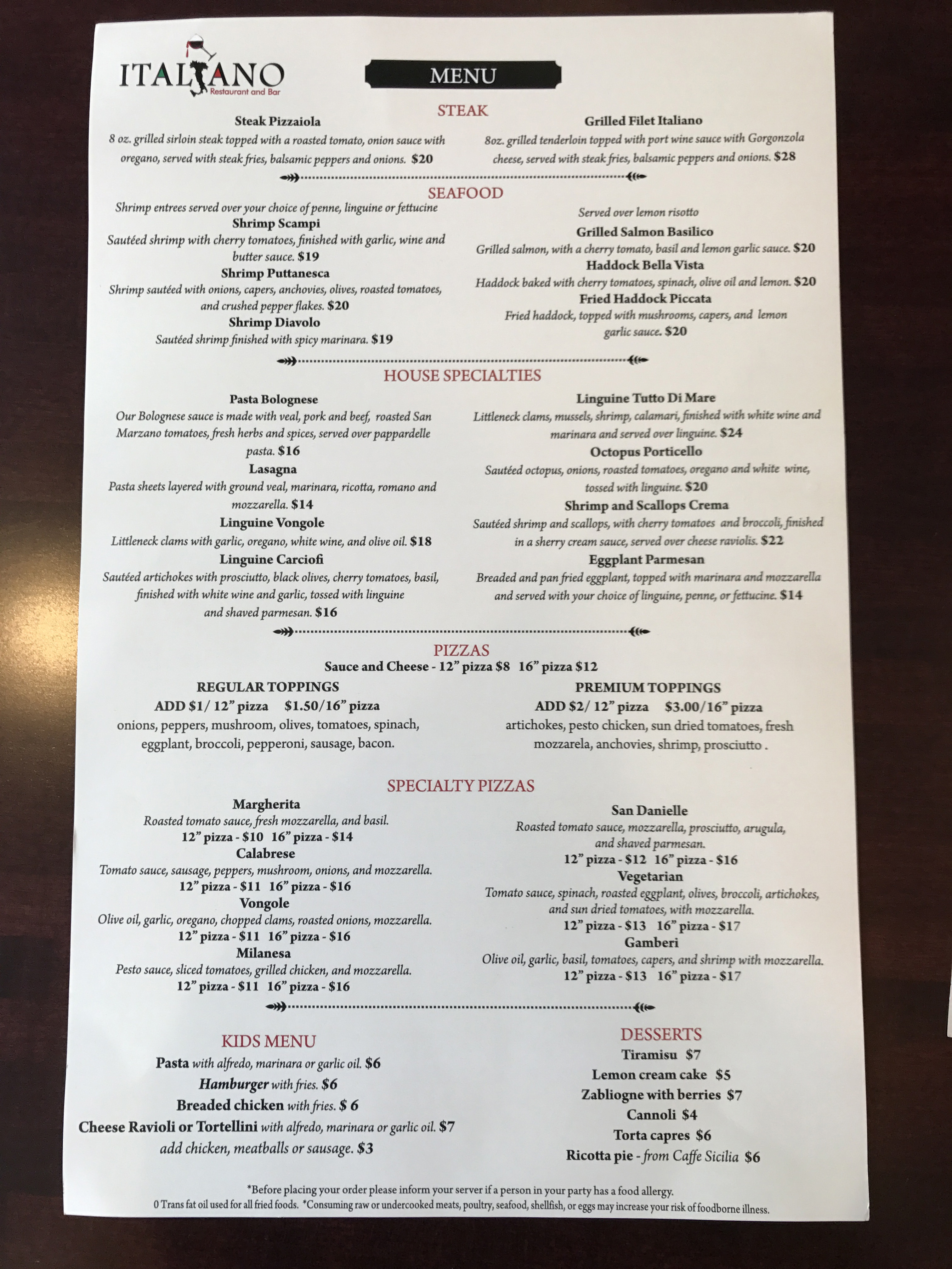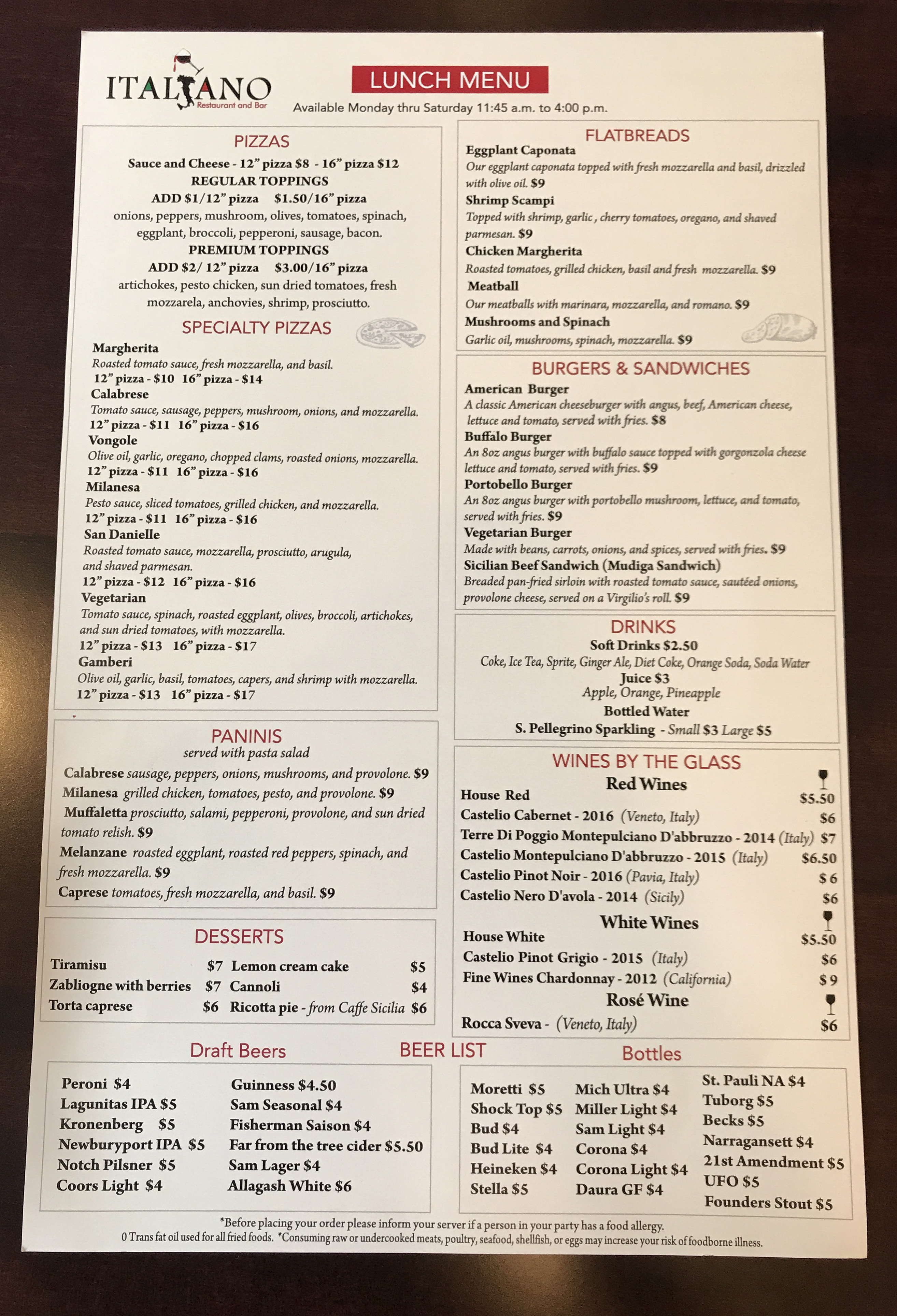 Italiano is located at 64 Main Street. For more information, call 978-559-7638.