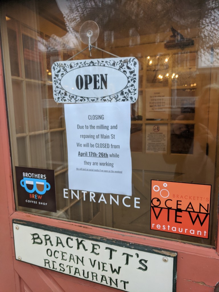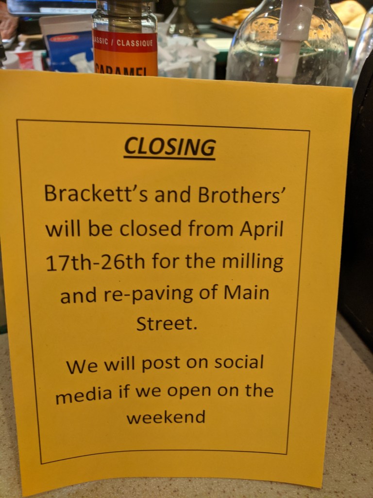 Check local businesses for updates. Bracketts/Brothers’ is closing a bit longer, from the 17-26th.