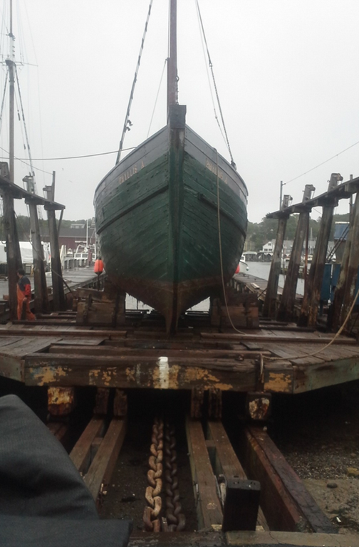 We have changed the restoration plan, with the immanent State Funding, and tomorrow the Phyllis A will be launched off the Railway, lifted with the Travel Lift, and moved to a repair spot in the parking lot of the Gloucester Marine Railways.