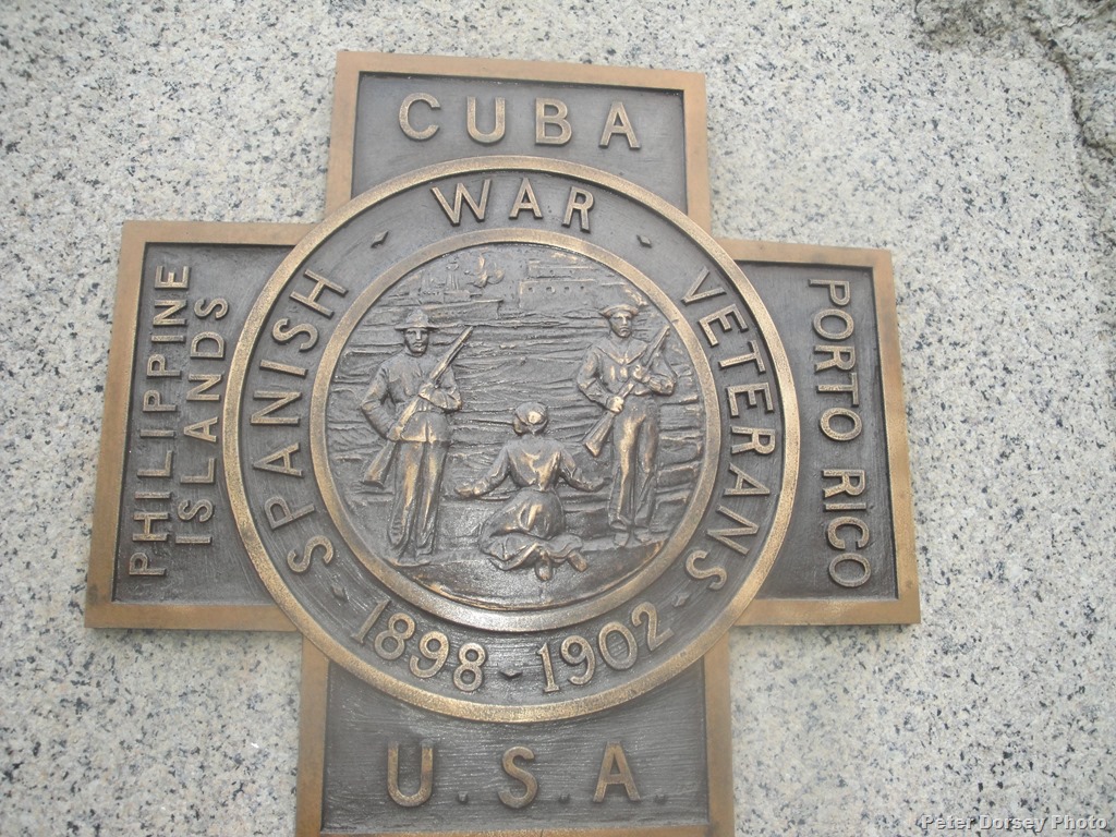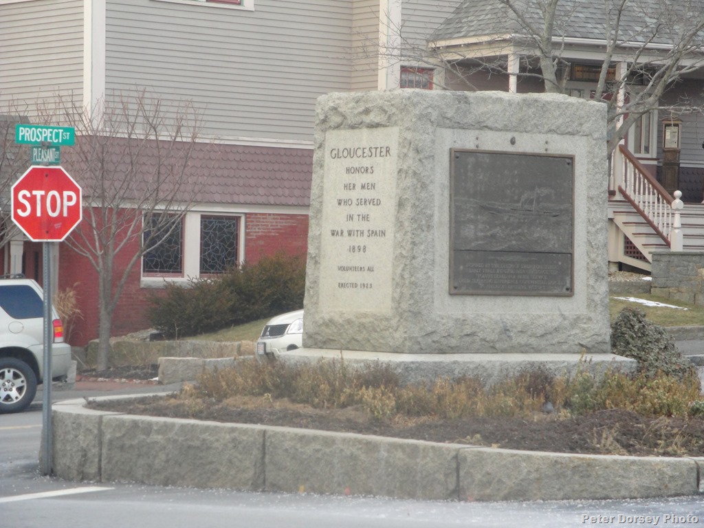 Another statue that I found both artistic and interesting is located at the intersection of Prospect and Pleasant Streets. It is made of large granite blocks, and commemorates the War with Spain from 1898 to 1902, and the Gloucester men who served then, ” Gloucester Honors Her Men Who Served in the War With Spain, 1898, Volunteers All, Erected 1923″ There is a copper relief plaque commemorating the Liberation of Cuba on one side honoring, “Gloucester’s Sons, 100 Strong” and on the other side a copper relief plaque showing the U.S.S. Gloucester, and commemorating her “Sinking of the Spanish Destroyers Pluton and Furor” in July 1898, and the 300 men from Gloucester who “Volunteered for Naval Service”.
