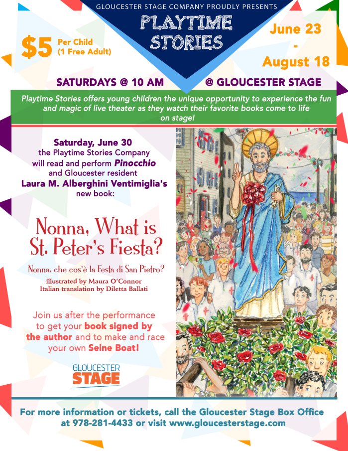 Gloucester Stage Company proudly announces a special Playtime Stories event celebrating St. Peter’s Fiesta with a live performance of Laura M. Alberghini Ventimiglia’s NONNA, WHAT IS ST. PETER’S FIESTA? on Saturday, June 29 at 10 am at Gloucester Stage, 267, East Main Street, Gloucester. An engaging combination of children’s stories and live performances for ages 2 and older, Playtime Stories offers young children the unique opportunity to experience the fun and magic of live theater as they watch their favorite books come to life onstage. To celebrate Fiesta on Saturday, June 29 the Playtime Stories Company will read and perform Gloucester resident Laura M. Alberghini Ventimiglia’s new book, NONNA, WHAT IS ST. PETER’S FIESTA? and Tomie dePaola’s STREGA NONA. Following the performance audience members will be invited to join the Playtime Stories Company in fun and interactive workshops and crafts relating to the story. On June 30 audience members can craft their own Seine boat and participate in Playtime Stories Seine Boat Races at GSC and make their own Fish magnets.