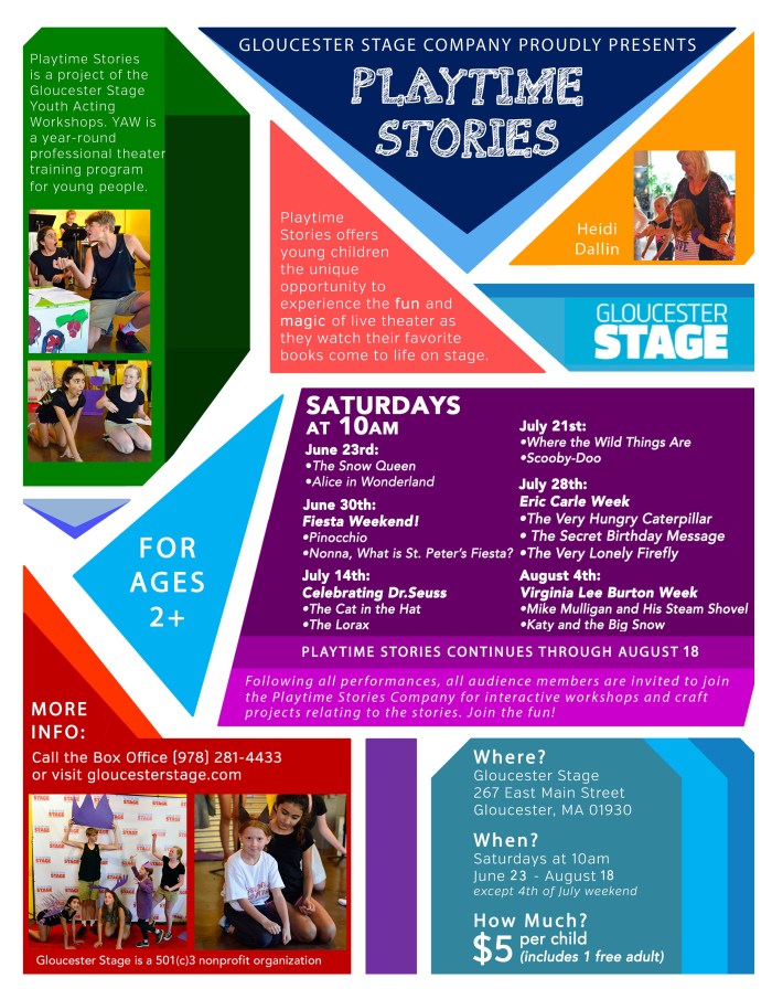 All Playtime Story performances are held at 10 am at Gloucester Stage, 267 East Main Street, Gloucester, MA. Admission is $5 for one child (includes one free adult). Free coffee and donuts provided by Jim’s Bagel and Bake Shoppe. For more information or tickets, call the Gloucester Stage Box Office at 978-281-4433 or visit http://www.gloucesterstage.com