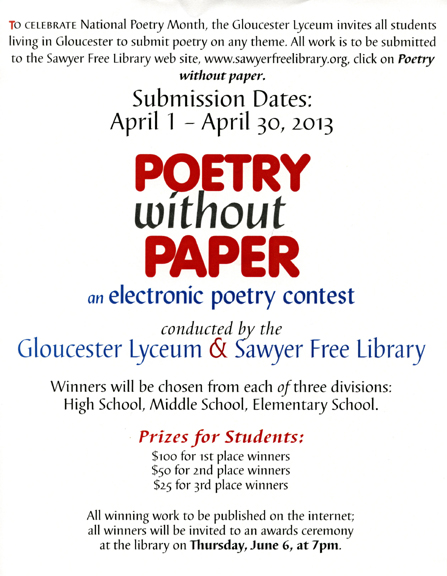 To celebrate April as National Poetry Month, the Gloucester Lyceum and Sawyer Free Library is proud to have participated in its twelfth annual Poetry Without Paper contest.