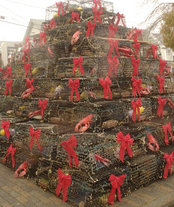 Provincetown lobster trap tree adorned with cheap imported Chinese pre-made slave labor ribbons-