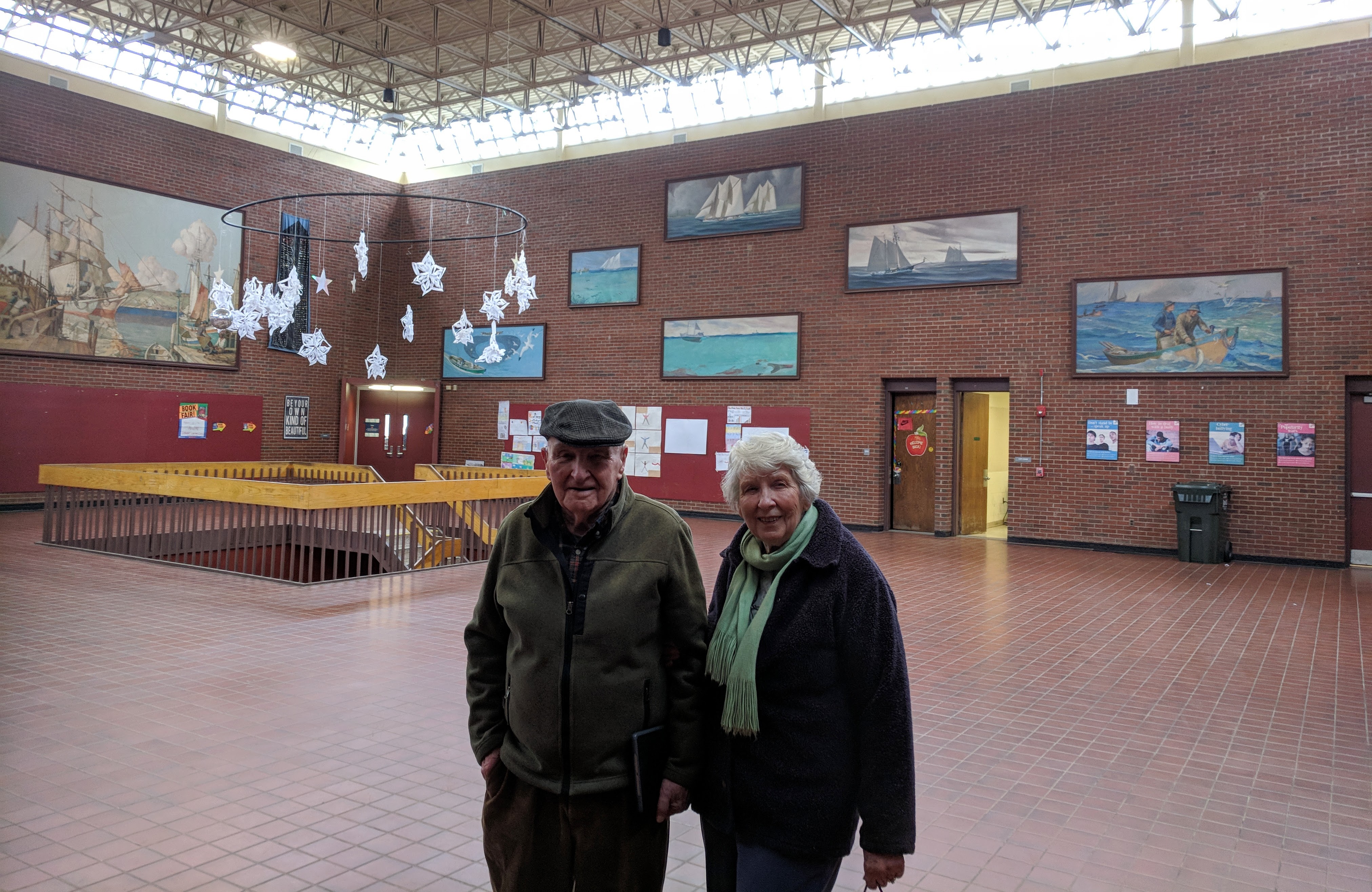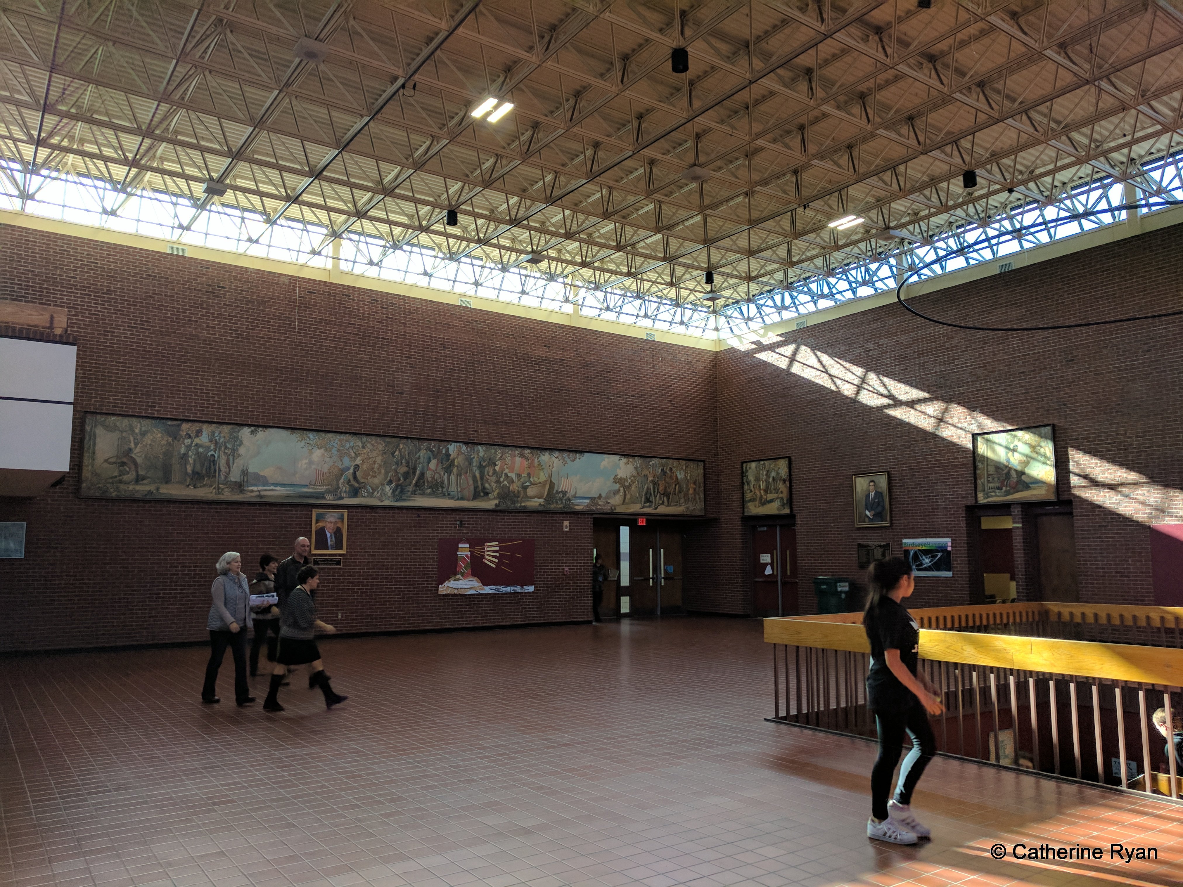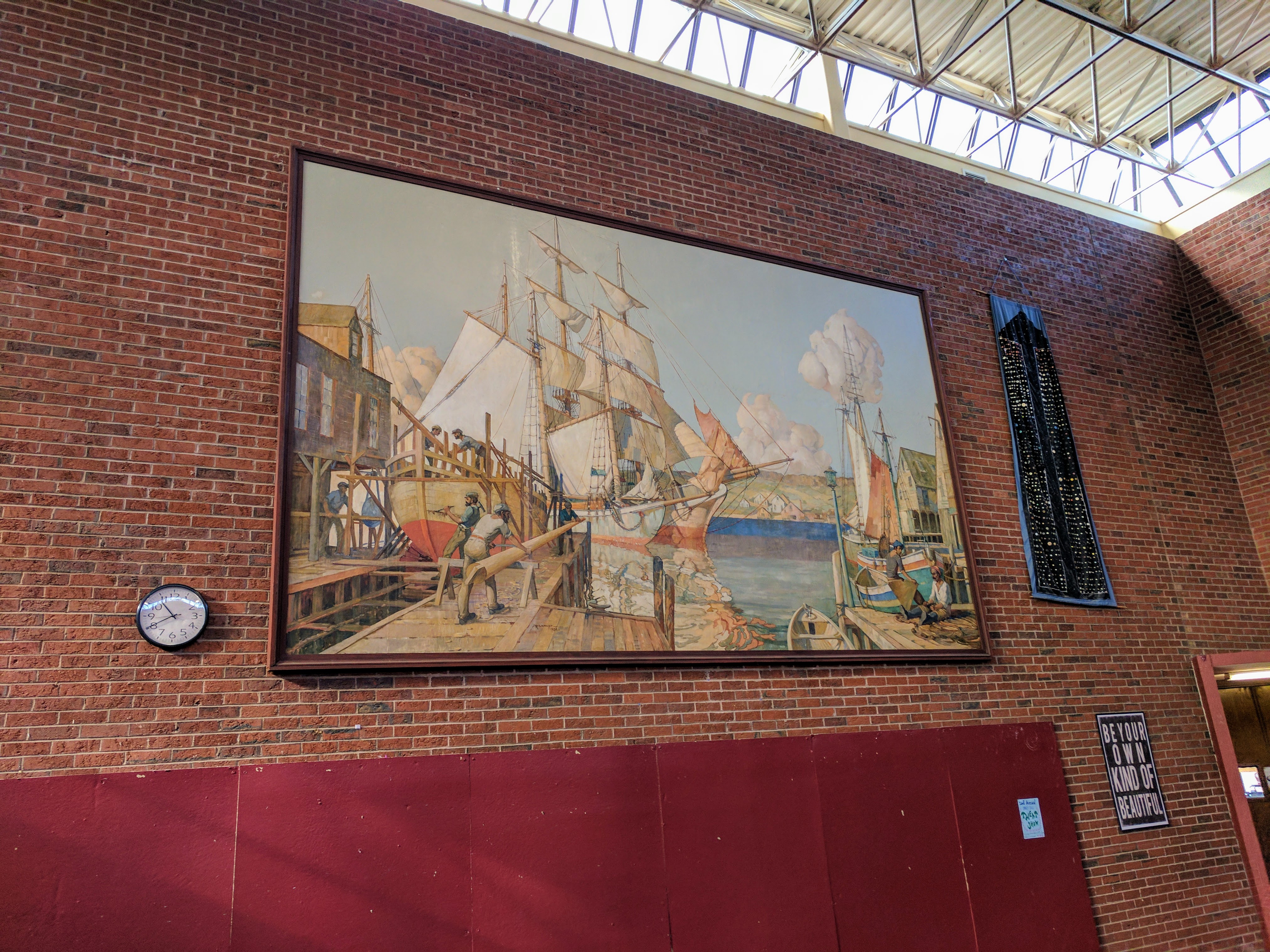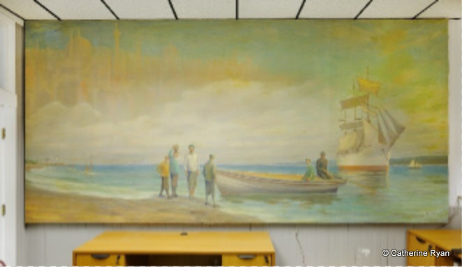 Within O’Maley Innovation Middle School are a complete though out of order Frederick Mulhaupt series (originally at Maplewood); a partial and crucial section from a 2nd immersive series (originally at the High School); and “Our Daily Bread” by Frederick Stoddard, cropped. There are important works by Larry O’Toole commissioned by Ben Pine for the Gloucester Fishermen Institute and YMCA that were painted in the 1940s. Ron Gilson, Gloucester native, author and local historian, helped with the attribution and remembered the completed art being carried out the door. Gilson was great friends with Ben Pine, his first boss, and knew O’Toole.