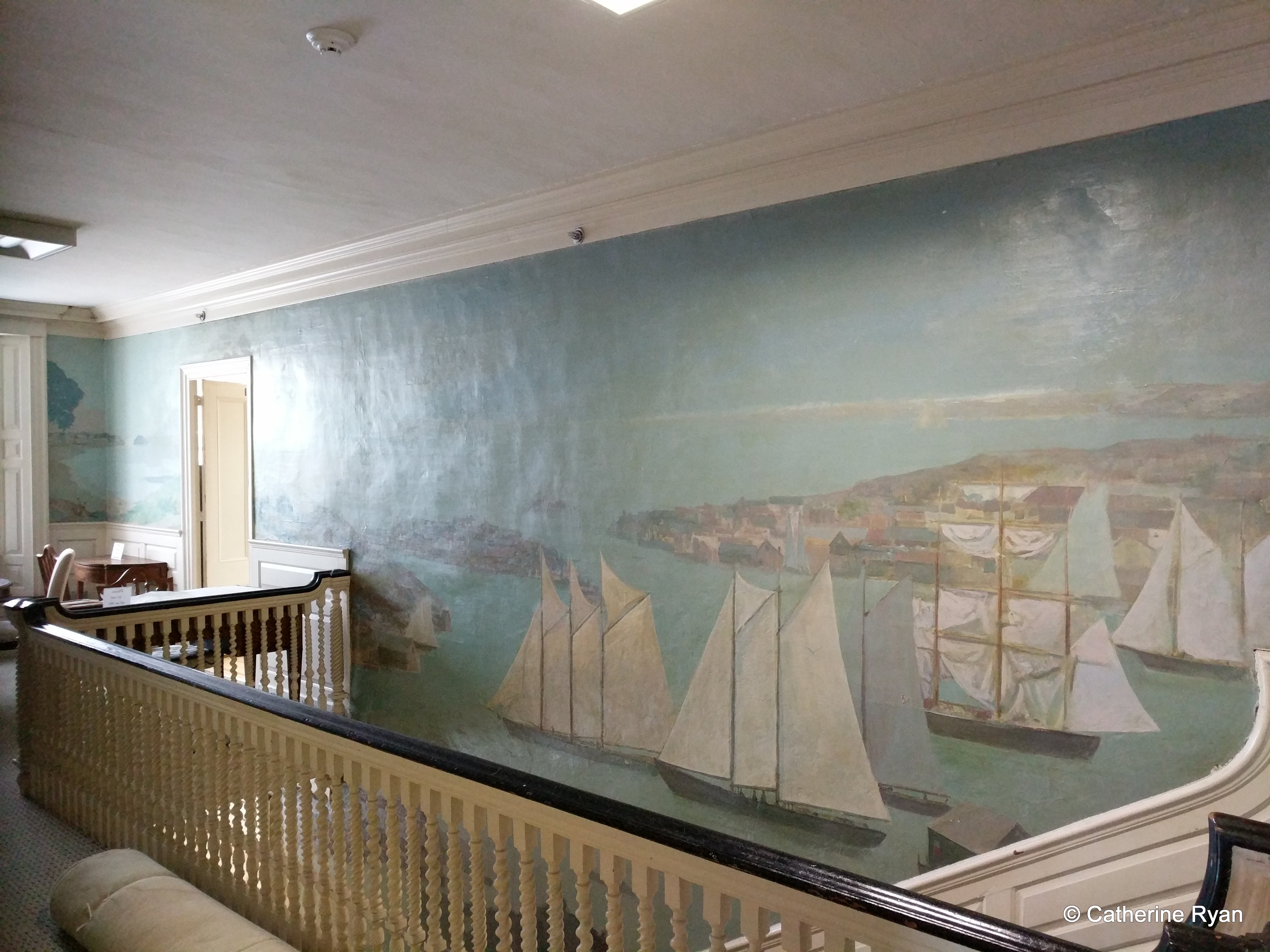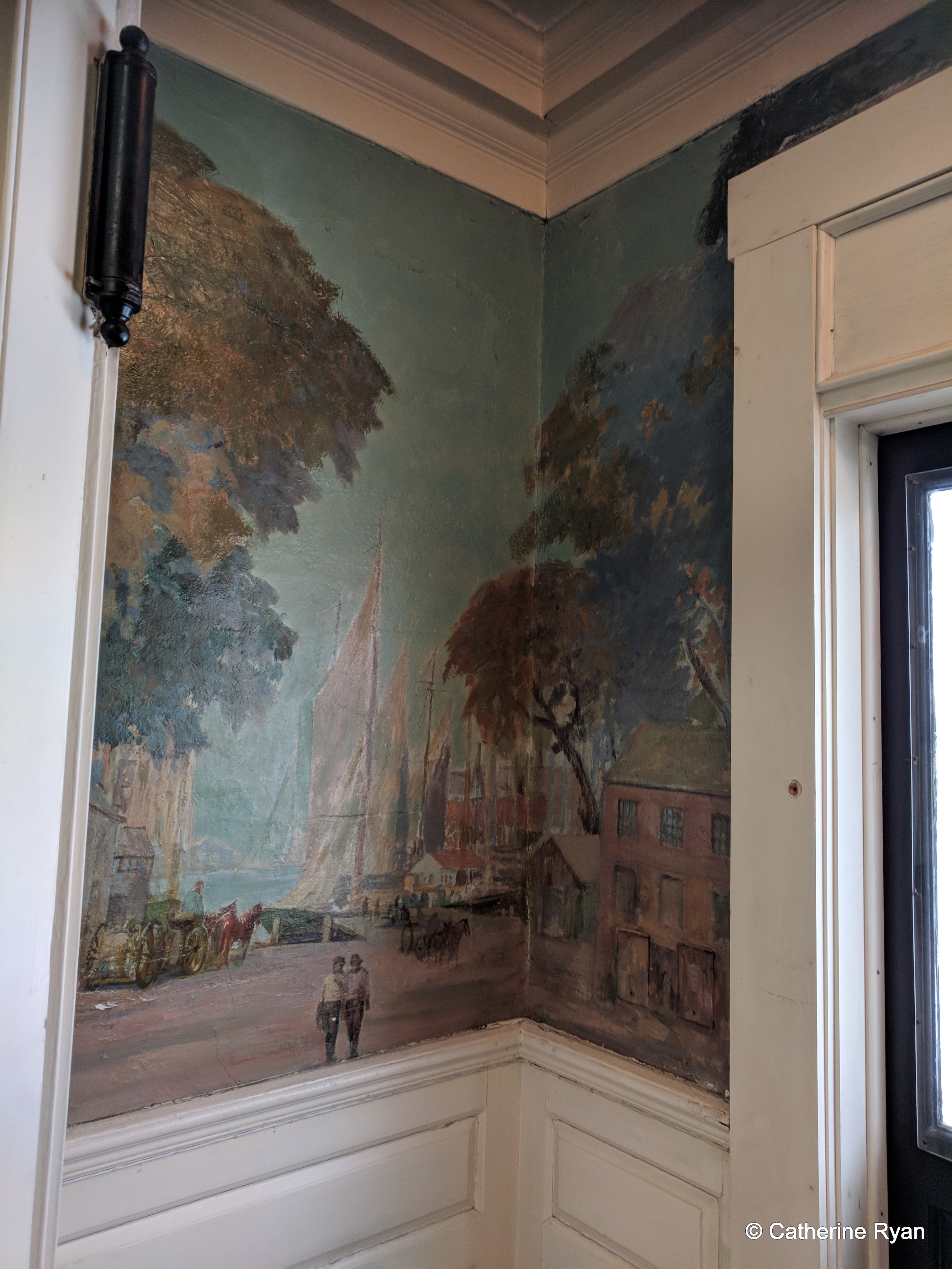 Within Sawyer Free Library are the city’s only New Deal works painted directly on plaster walls. Frederick Stoddard’s designs throughout the Saunders house encompass the first floor entryway, two story stairwell, and 2nd story wrap around stairwell hall. He described this two-story “decoration” above wainscotting upstairs and down as “a conventionalized treatment of the Gloucester region”. Familiar scenes include Dogtown “Moors”.