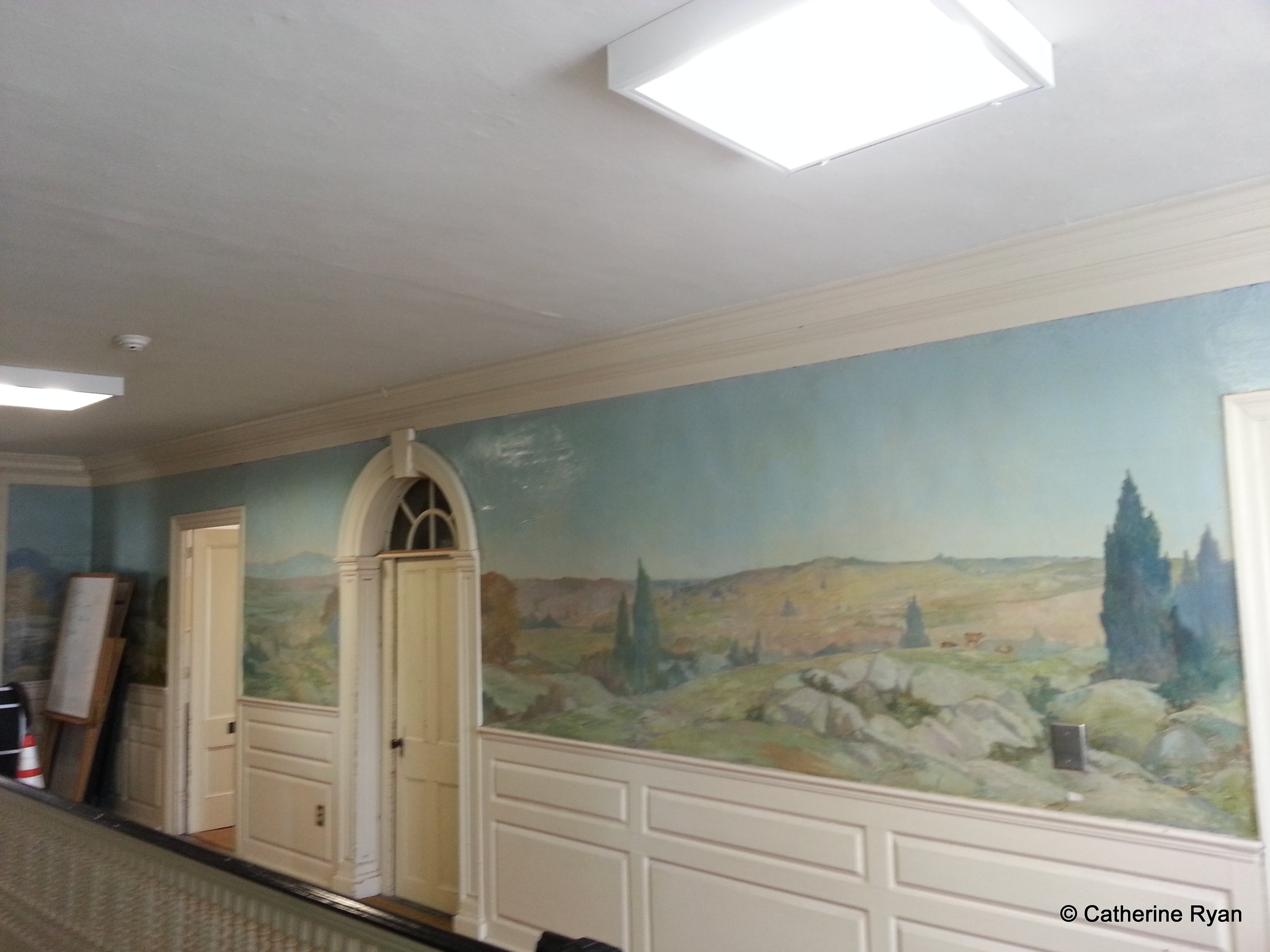 Oscar Anderson painted seven soft hued and dreamy murals for Hovey School including three panoramas. Four smaller works from this school are missing since ca.1972 or later. Does seeing a few of them together help you picture the Hovey school interior?