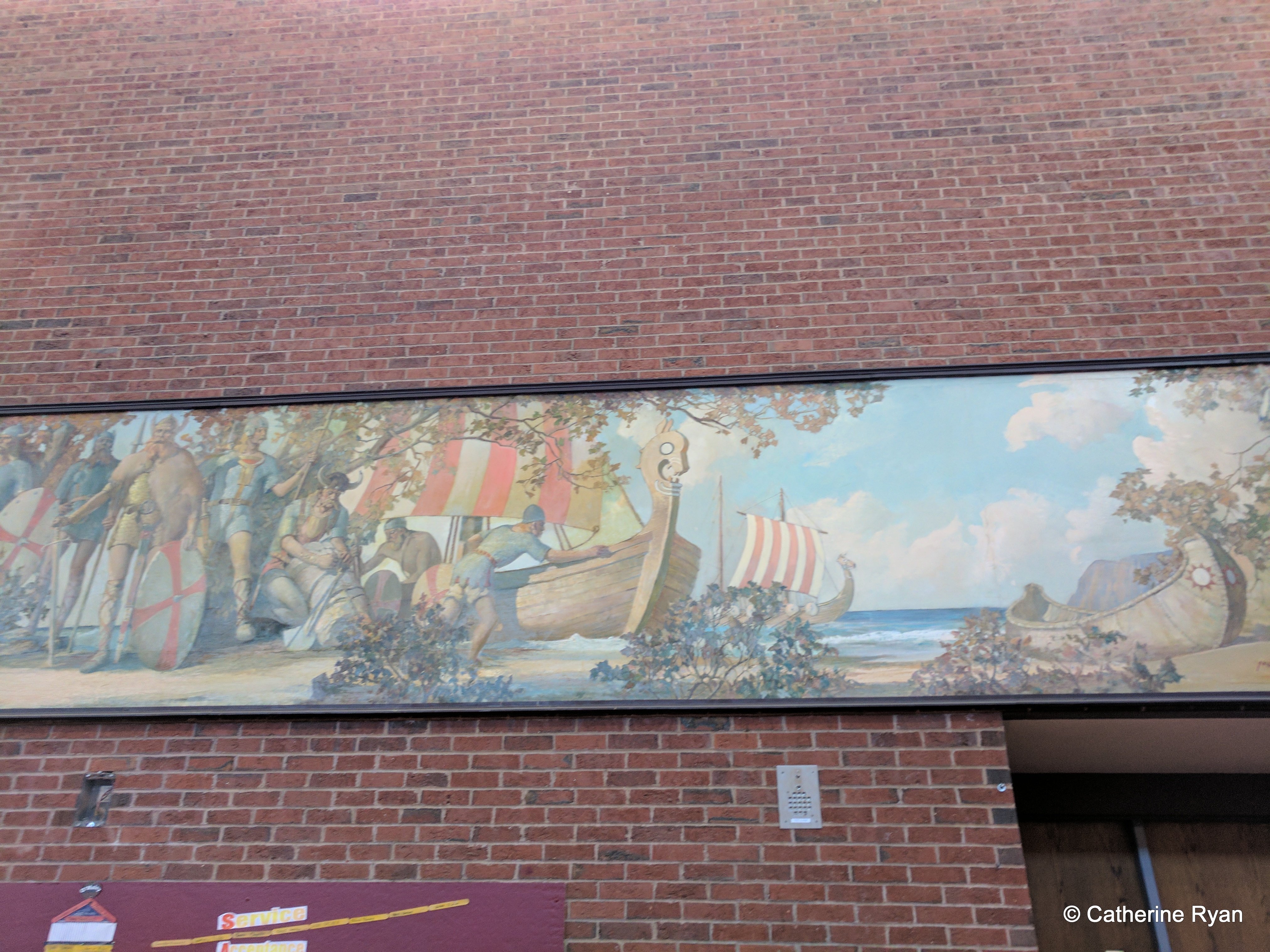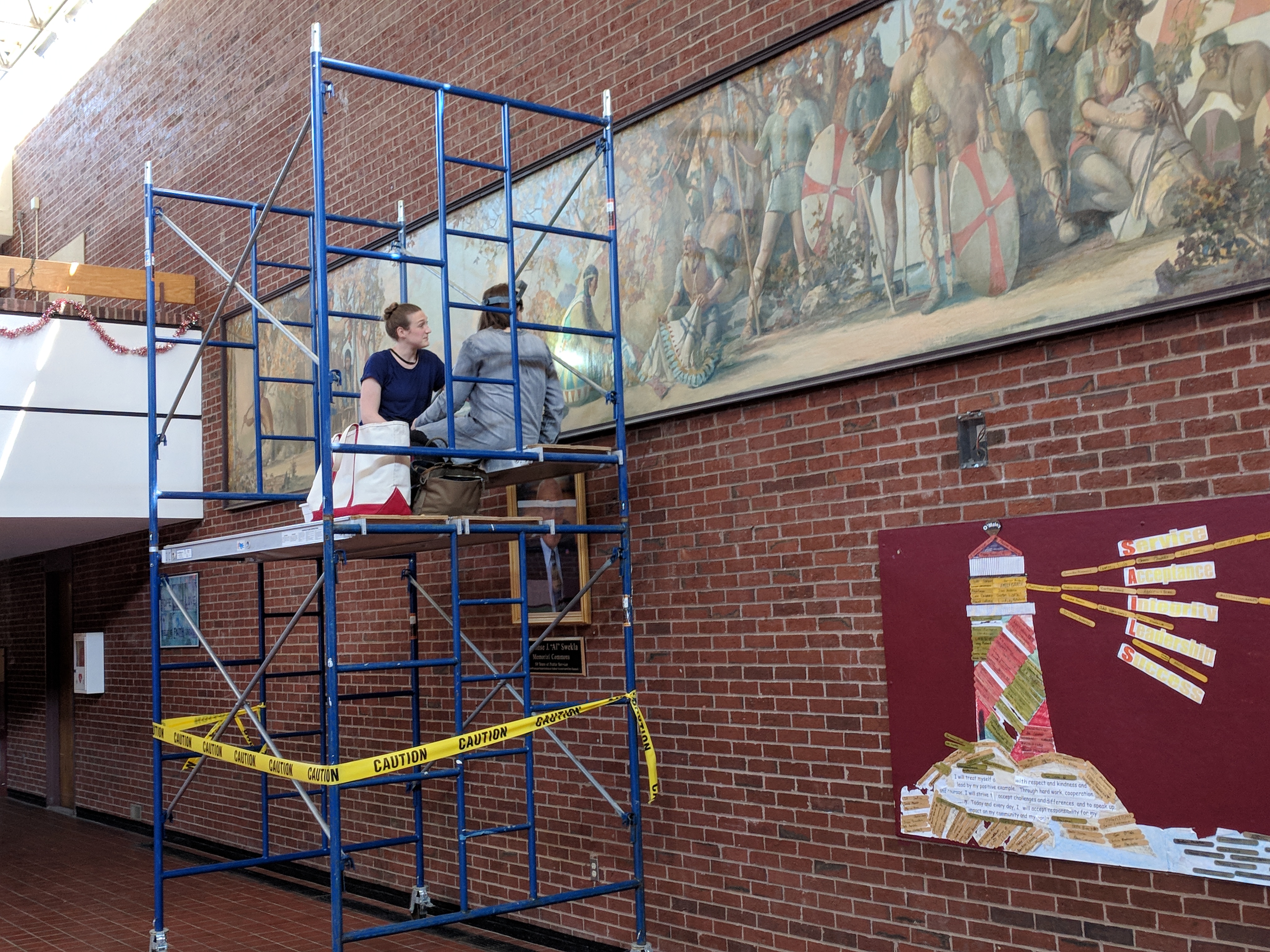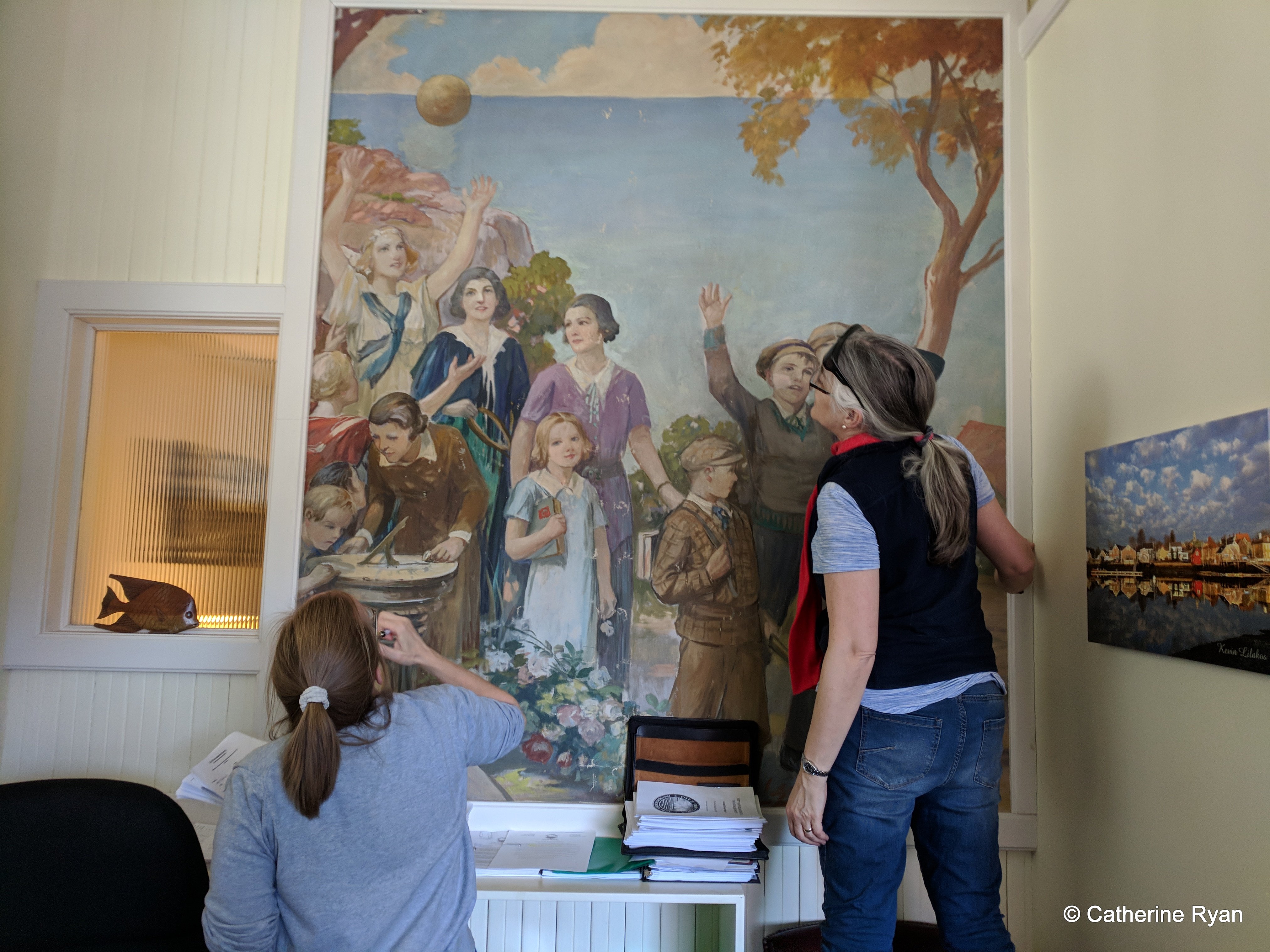 above: sections from Mulhaupt’s fantastical “Landing of the Viking Thorwald in Vinland” 1935; and central panel “Gloucester harbor” 1936 | below: DPW inspecting the O’Toole 1940s murals (photo 2015)