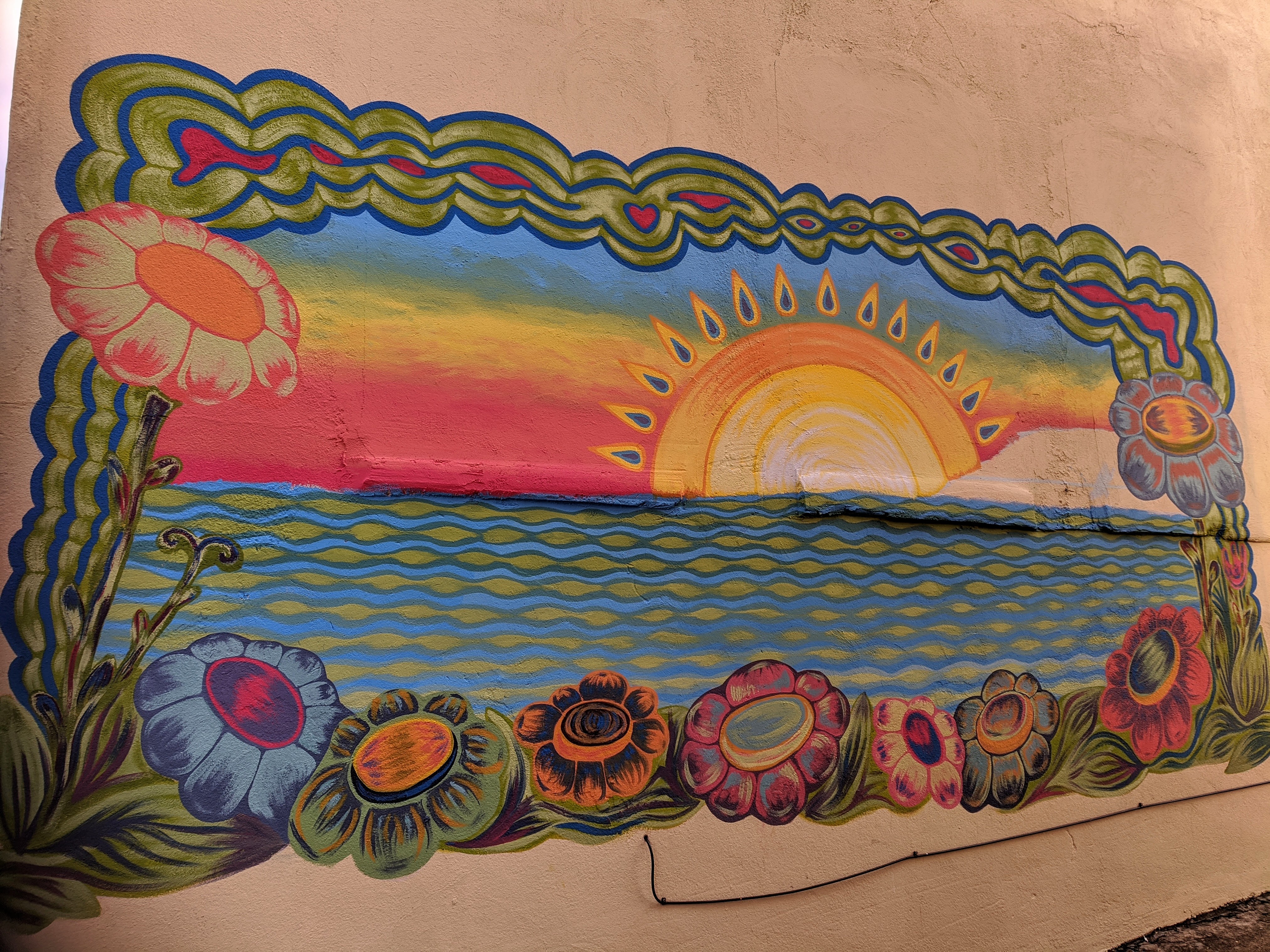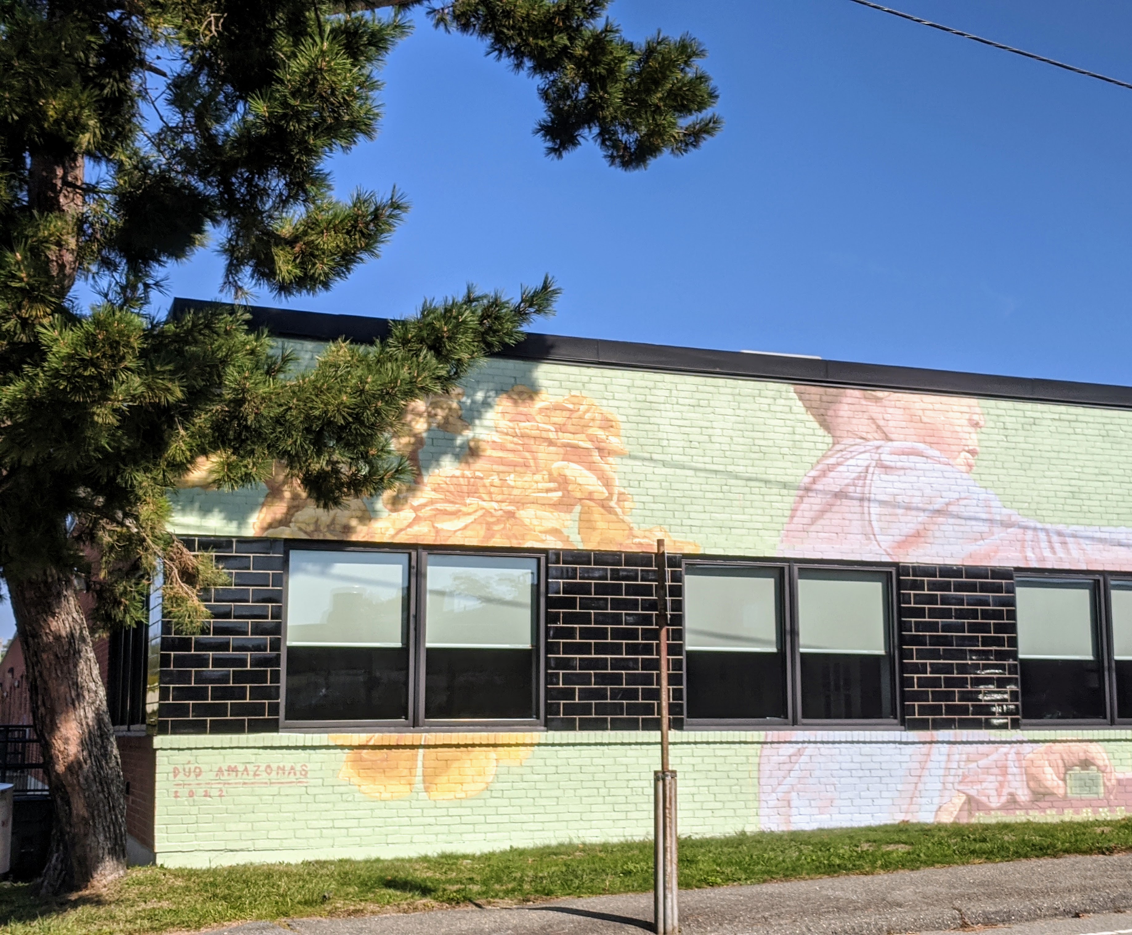 Looping back from Dunfudgin and the high school to Emerson Avenue, I was delighted to encounter the soft and striking mural on the Pathways building, across the street from Open Door and the Veteran’s center.