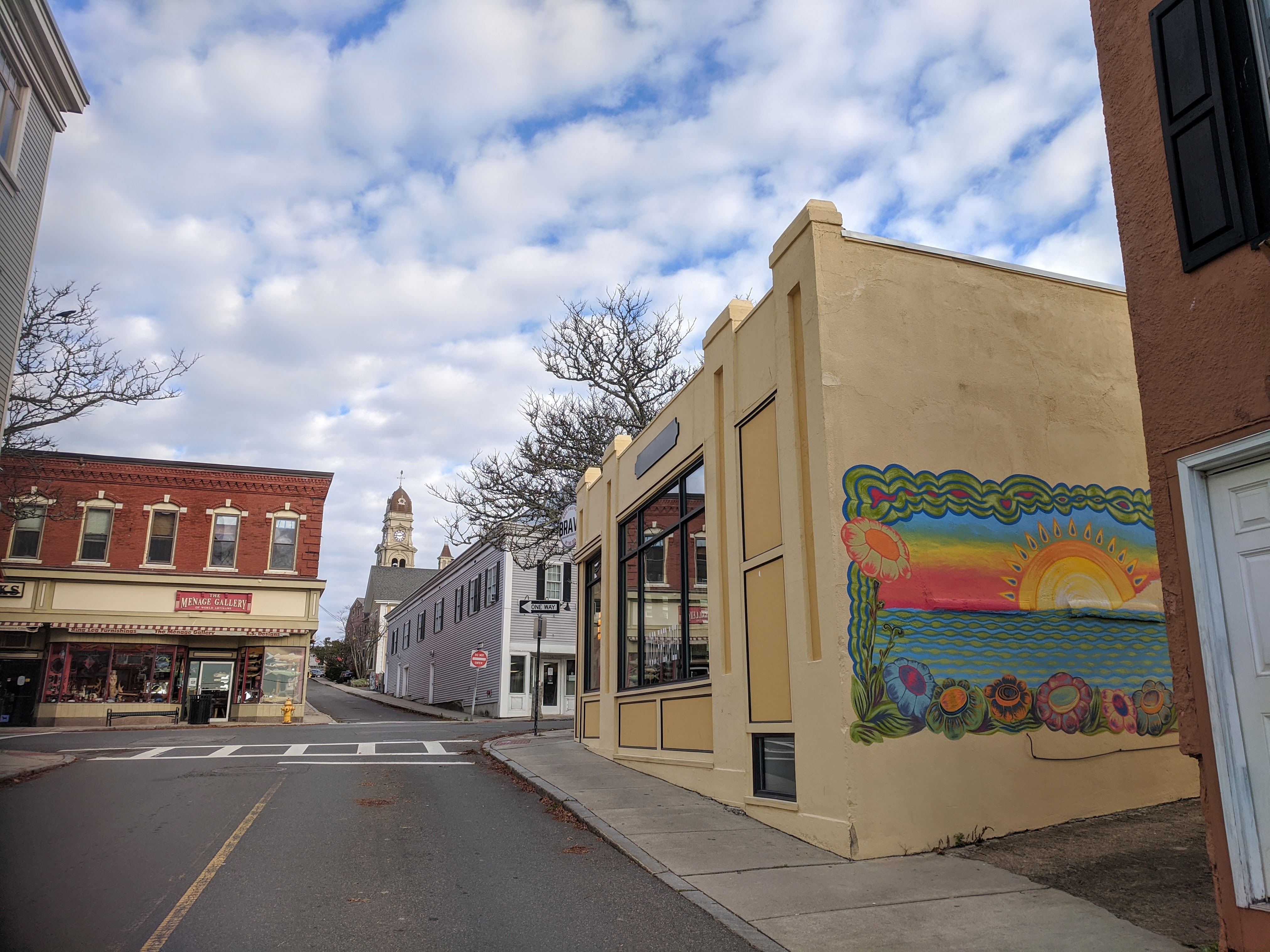 Exterior mural could be visible from the next blocks: oblique angle view back to mural wall on Elm Street from Pleasant Street (between Cape Ann Museum and Jane Deering Gallery)