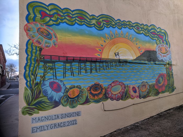 Emily Grace finished “Magnolia Sunshine” on Nov. 27, 2022. Did you spot the cherished landmarks? The completed mural features local scenes: a sunny surrealist horizon and lush floral border, Magnolia pier, harbor, and Kettle Island.