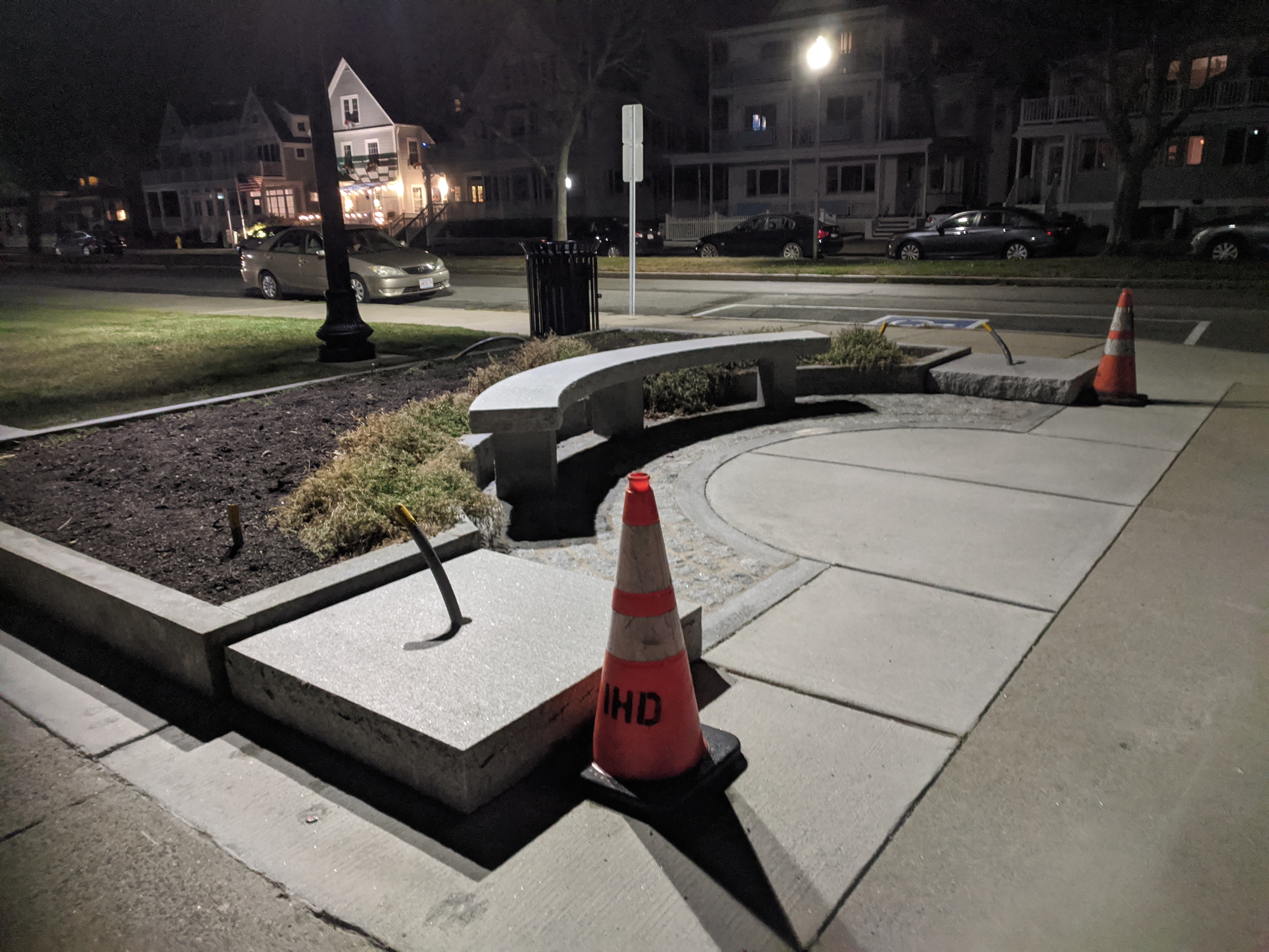 Working with DPW, Ann Gilardi Johnson and Generous Gardeners design enhancements have been incorporated all along the Boulevard. See the plans and read more about that scope in a prior GMG post from 2017 here. The new flower beds and curved bench design astride the Fisherman at the Wheel replaced bench pairs and barrels long present.