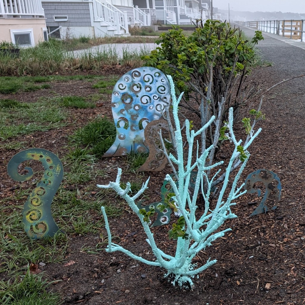 Friendly octopus garden? Kraken Billy goats gruff? The tentacled creature crawling under the sea, amid the rosa rugosa seaweed coral, is sure to engender imaginative story walks on the Long Beach seawall. And this metal art is a playful calling card.
